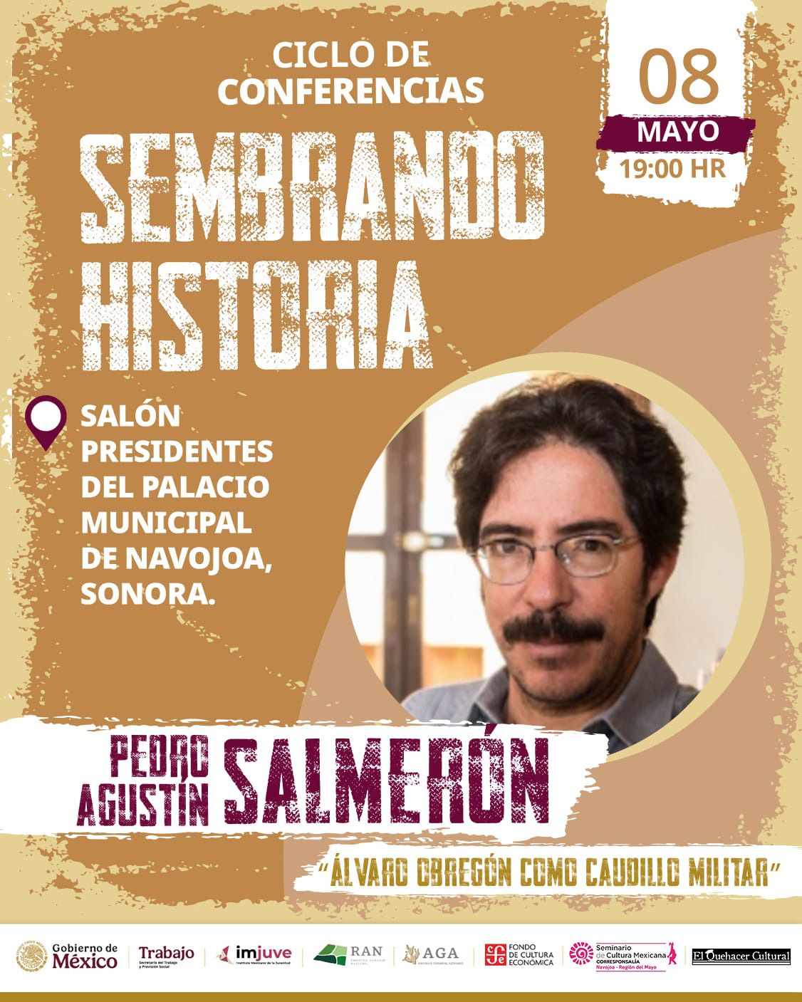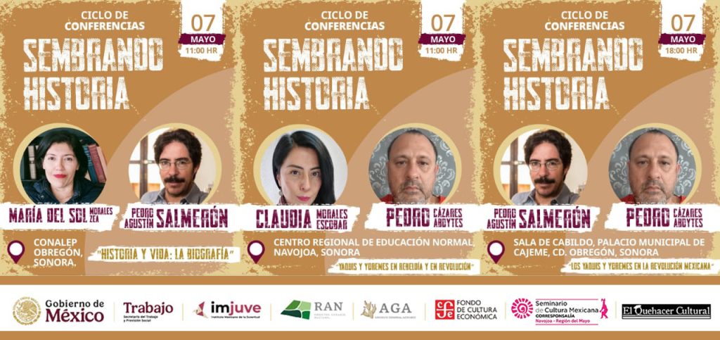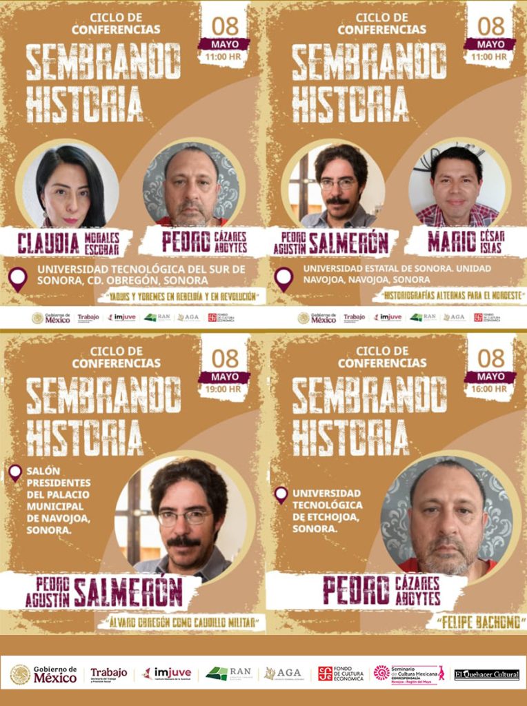 El ciclo de conferencias del programa Sembrando Historia en nuestro estado es posible gracias a la coordinaciÃn con el Gobierno del Estado de Sonora, los Gobiernos Municipales del Sur de Sonora, las instituciones de educaciÃn superior y El Seminario de Cultura Mexicana, CorresponsalÃa Navojoa-RegiÃn del Mayo, con el apoyo del Fondo de Cultura EconÃmica (FCE), el Archivo General de la NaciÃn (AGN), MemÃrica y el Archivo General Agrario (AGA).