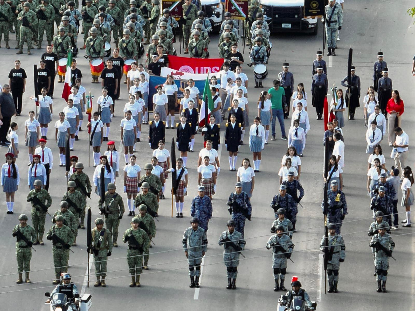 Al evento, el cual se desarrollà desde la avenida SerdÃn, por la calle Pino SuÃrez y hasta la confluencia del bulevar RodrÃguez y calle RevoluciÃn, asistieron cientos de hermosillenses que disfrutaron del desfile de 15 banderas, 130 integrantes de la Guardia Nacional, 261 del EjÃrcito Mexicano, 52 de la Fuerza AÃrea Mexicana, 112 de la SecretarÃa de Marina, 50 del Servicio Militar Nacional y 168 de corporaciones de Seguridad PÃblica Estatal y Municipal.