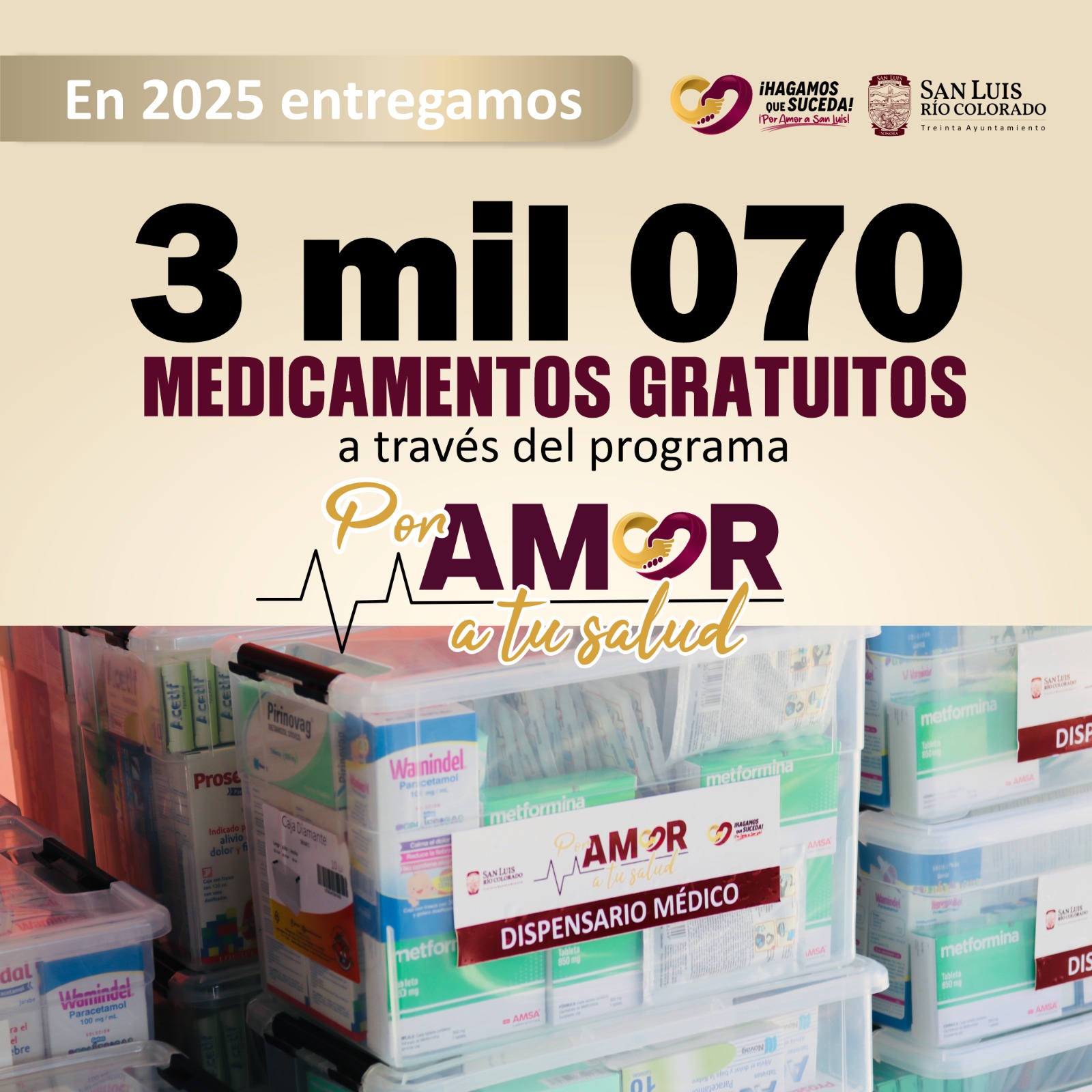 San Luis RÃo Colorado, Sonora (Diciembre 20 de 2025).- Como parte del compromiso del 30 Ayuntamiento de garantizar el acceso a la salud en las comunidades mÃs alejadas, en este 2025 la DirecciÃn de Salud PÃblica Municipal entregà un total de 3 mil 070 medicamentos gratuitos en el valle, a travÃs del programa Por Amor a Tu Salud.