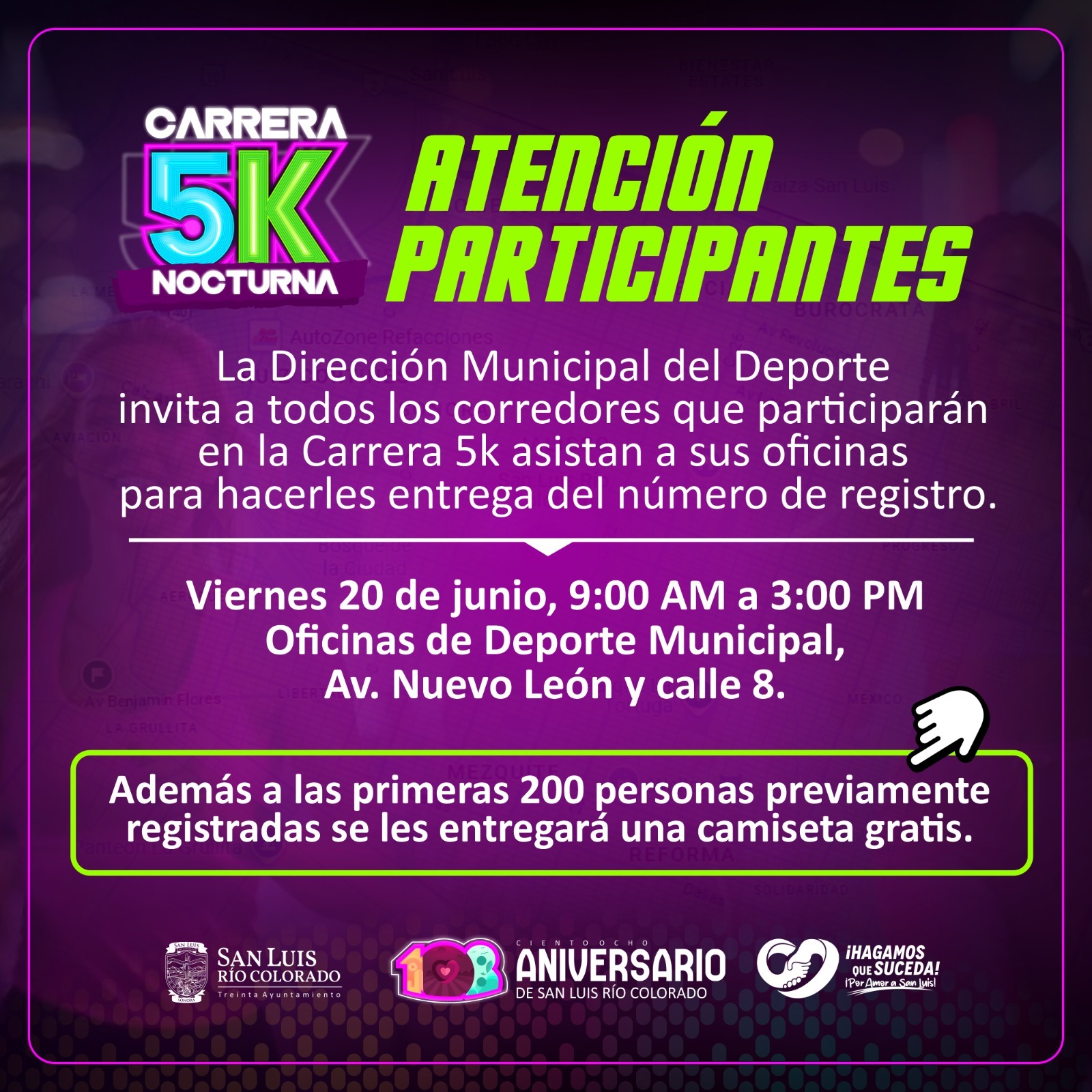 En el marco de los festejos por el 108 Aniversario de FundaciÃn de San Luis RÃo Colorado, la DirecciÃn de Deporte Municipal informa que este viernes 20 de junio se entregarÃn camisetas conmemorativas a las primeras 200 personas inscritas en la Carrera Nocturna 5K que acudan en las instalaciones de la dependencia.