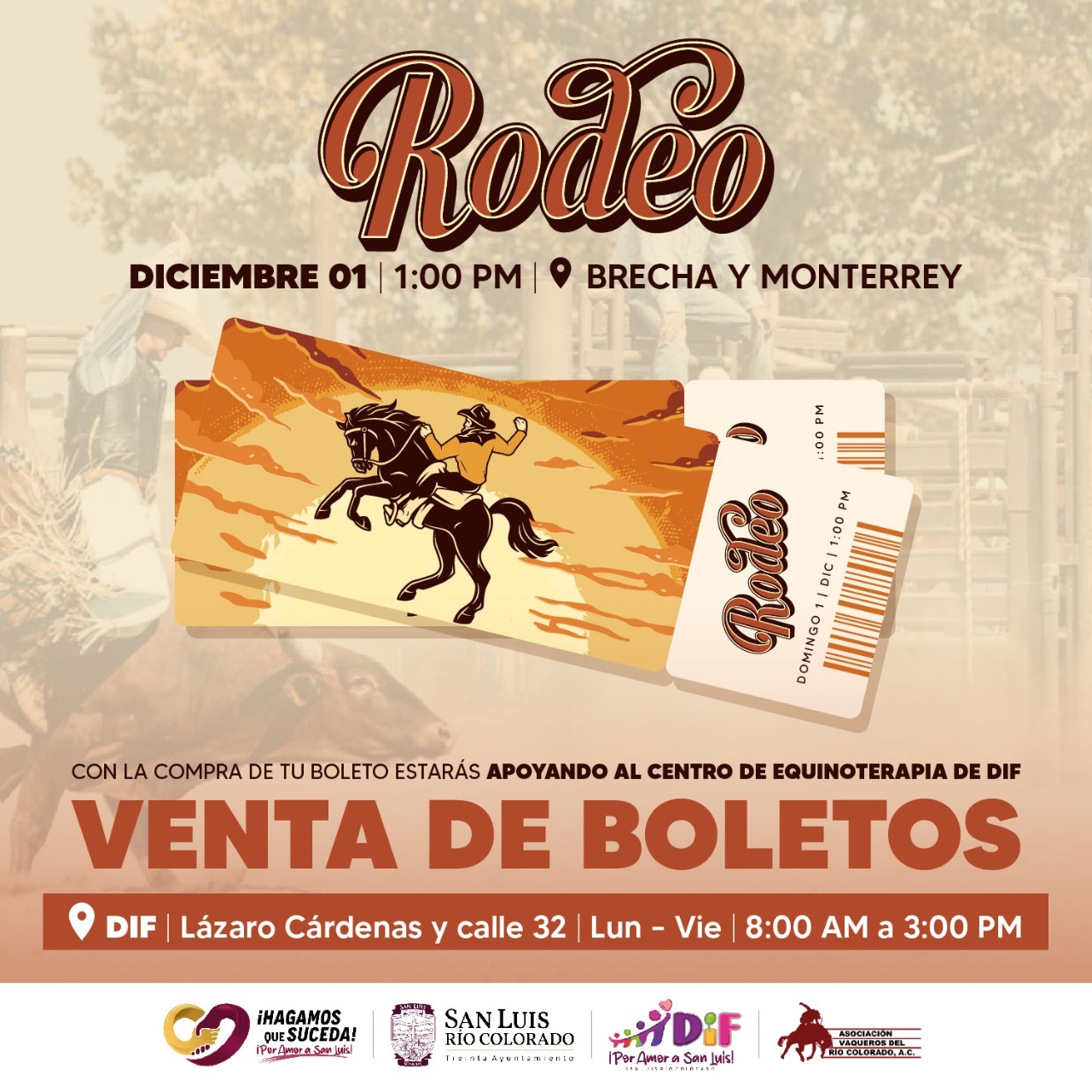 San Luis RÃo Colorado, Sonora (Noviembre 28 de 2024).- Con botas y sombrero a la mano, la AsociaciÃn de Vaqueros del RÃo Colorado, en colaboraciÃn con el 30 Ayuntamiento a travÃs de DIF Municipal, se encuentra lista para recibir con toda la actitud a las familias sanluisinas este domingo 01 de diciembre en el Rodeo a beneficio de la Unidad BÃsica de RehabilitaciÃn (UBR).