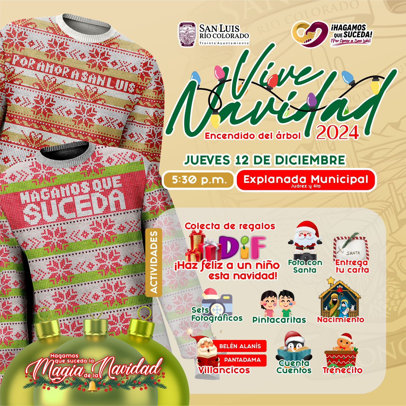 San Luis RÃo Colorado, Sonora – Para dar inicio a las tradicionales fiestas decembrinas, hoy la magia navideÃa iluminarà el arbolito de la Explanada Municipal con una celebraciÃn llena de mÃsica, diversiÃn, convivencia familiar y grandes momentos en familia en âVive Navidad 2024â.