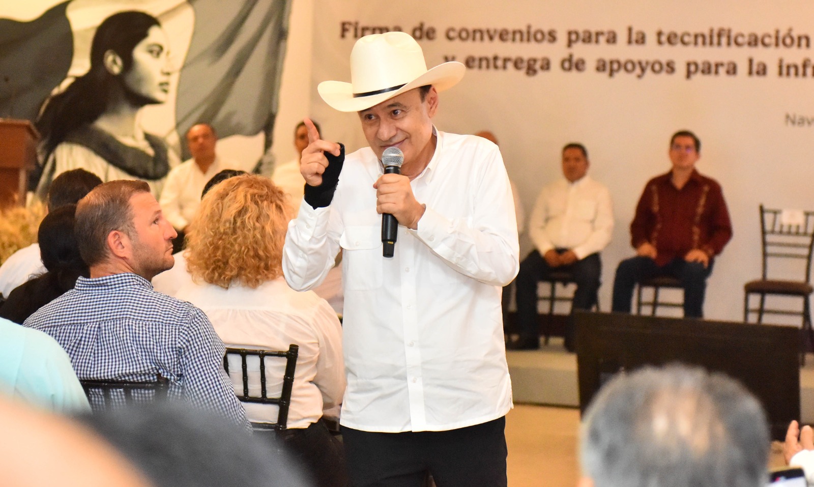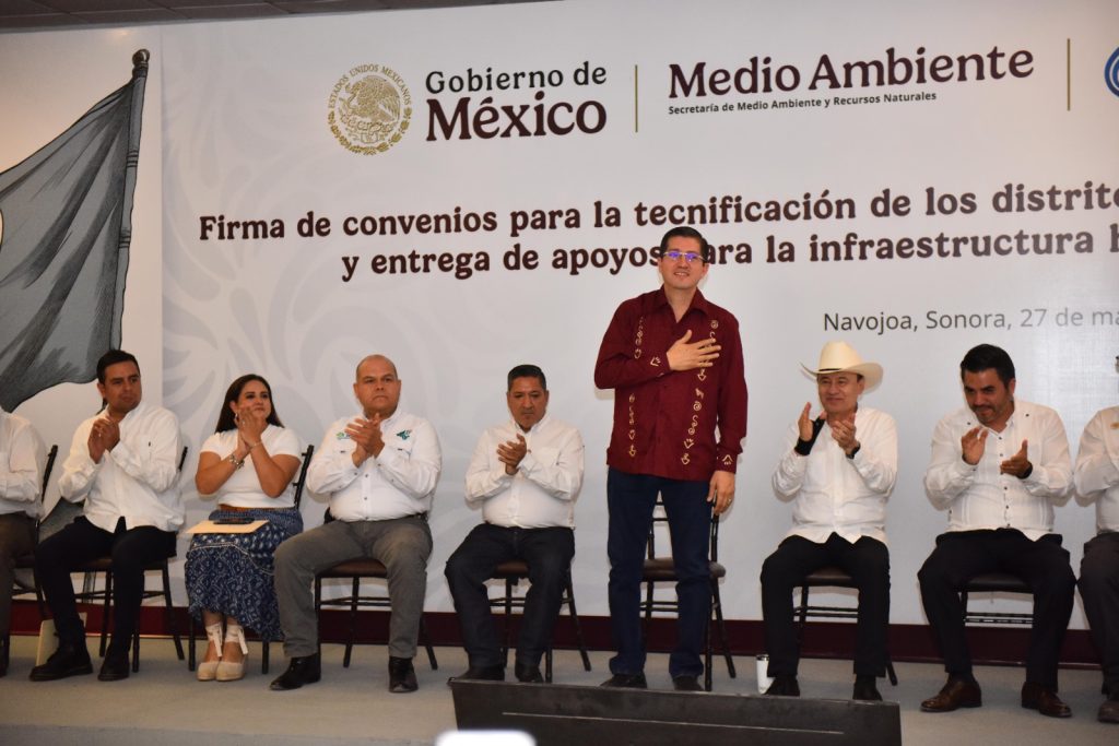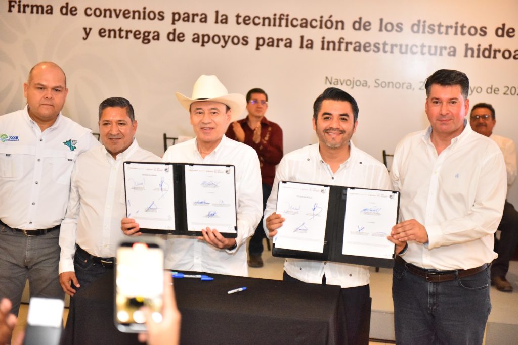 Navojoa, Sonora, 27 de mayo 2025.- Al calificar como un dÃa histÃrico en Sonora, particularmente para el campo, con el destino de casi 251 millones de pesos para la tecnificaciÃn de infraestructura hidroagrÃcola en los valles del Mayo y Yaqui, el gobernador Alfonso Durazo MontaÃo atestiguà hoy la firma de convenios con las Sociedades de Usuarios de los Distritos de Riego 038 y 041.