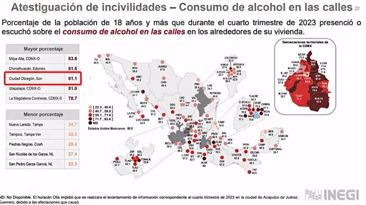 De acuerdo con la «AtestiguaciÃn de incivilidadesâConsumo de alcohol en las calles«, «el promedio de mayores de 18 aÃos y mÃs, que en el cuarto cuatrimestre del 2023 presencià o escuchà sobre el consumo de alcohol en las calles en los alrededores de su vivienda», Ciudad ObregÃn se ubica en el nada honroso tercer sitio de esta actividad, con un 81.1 por ciento.