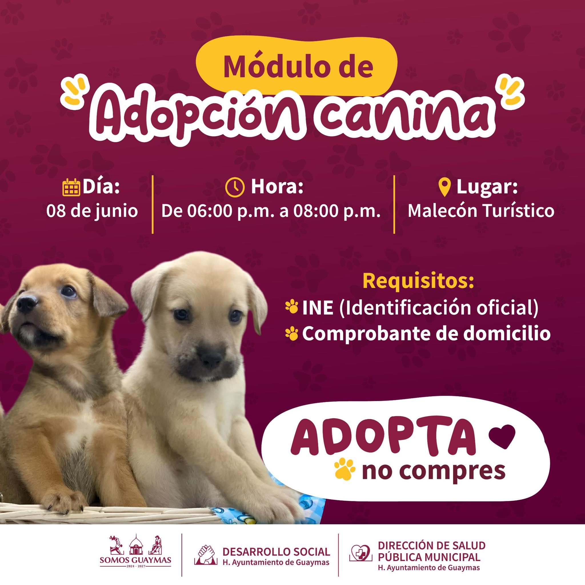 El Ayuntamiento de Guaymas, a travÃs de las Ãreas de Desarrollo Social y Salud PÃblica Municipal, llevarà a cabo un MÃdulo de AdopciÃn Canina este domingo en el MalecÃn TurÃstico de 18:00 p.m. a 20:00 horas. ð
