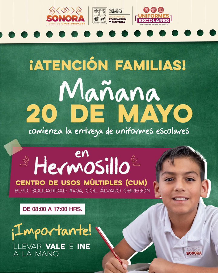La SecretarÃa de EducaciÃn y Cultura inicia este martes 20 de mayo la entrega de uniformes escolares gratuitos para estudiantes de educaciÃn bÃsica en Hermosillo. La distribuciÃn serà por orden alfabÃtico y en el CUM.