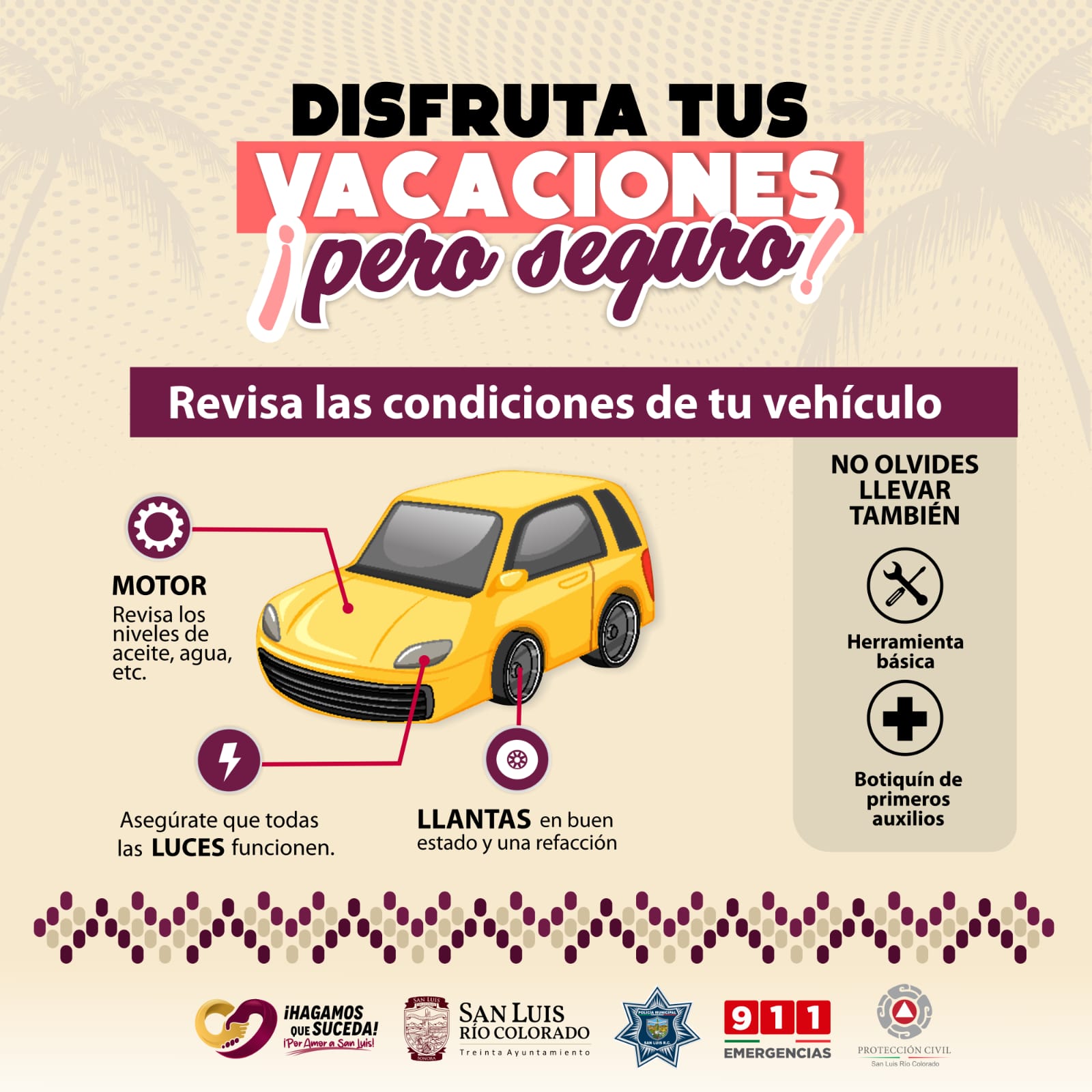 San Luis Río Colorado, Sonora (Abril 04 de 2026).- Con el objetivo de salvaguardar la integridad de las familias durante el próximo periodo vacacional de Semana Santa, el 30 Ayuntamiento a través de Seguridad Pública hace un llamado a la ciudadanía a adoptar medidas de prevención al momento de viajar por carretera, recordando que la seguridad es una responsabilidad compartida que comienza antes de salir de casa.