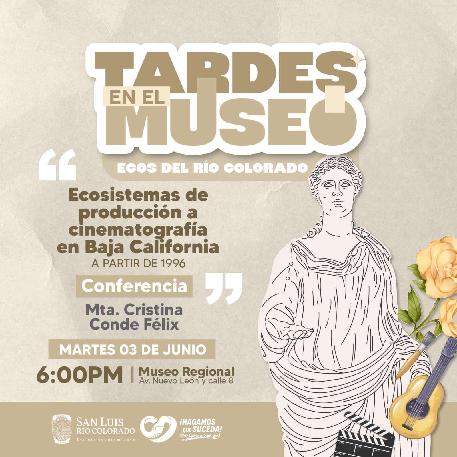 El 30 Ayuntamiento de San Luis RÃo Colorado, a travÃs de la DirecciÃn Municipal de Cultura, invita a la ciudadanÃa a una nueva ediciÃn del ciclo âTardes en el Museoâ, con la conferencia âEcosistemas de producciÃn cinematogrÃfica en Baja California a partir de 1996â, impartida por la Mtra. Cristina Conde FÃlix.