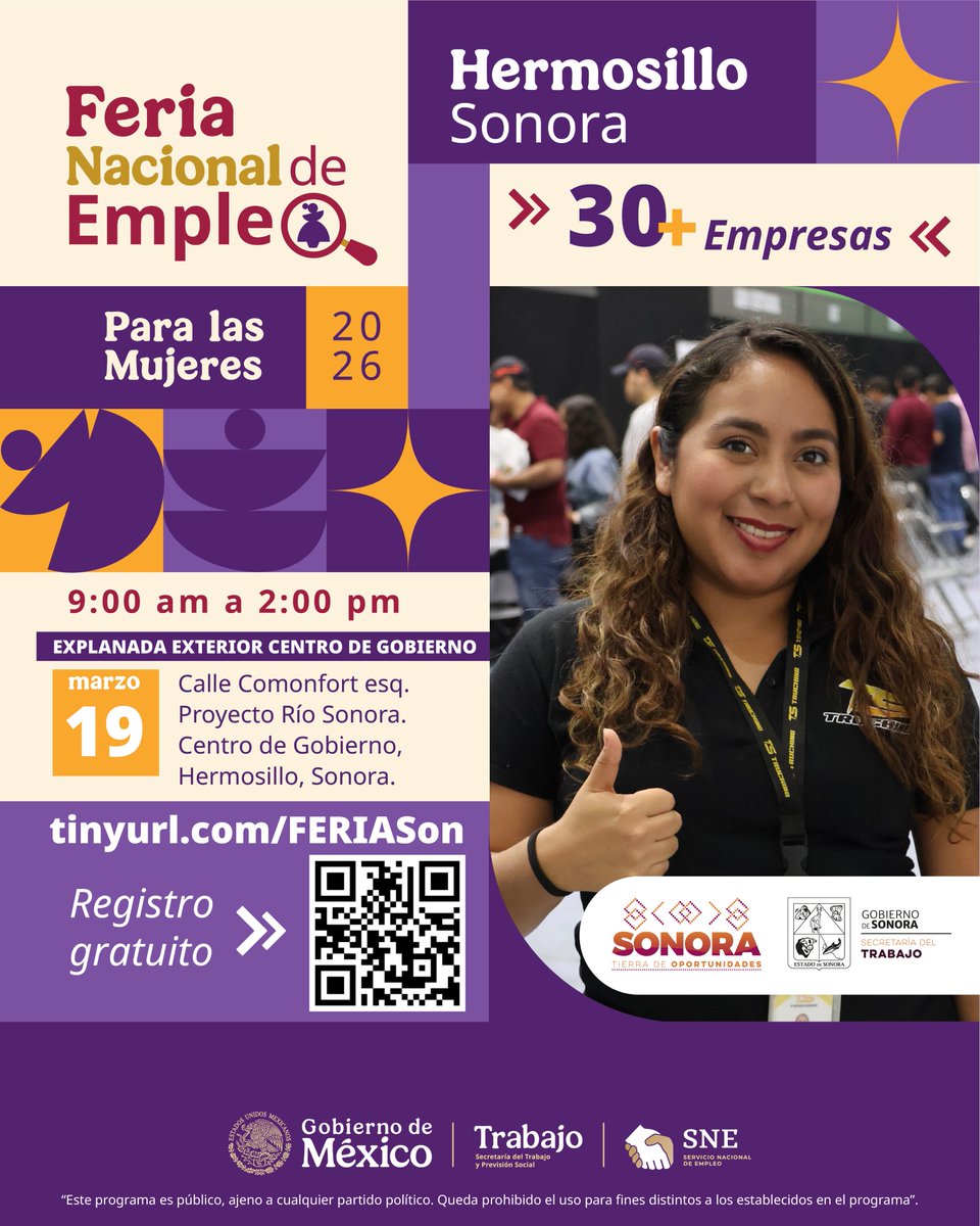 Hermosillo, Sonora; 5 de marzo de 2026.- Como parte de las actividades por el Mes de la Mujer, la SecretarÃa del Trabajo de Sonora anuncià la realizaciÃn de la Feria Nacional del Empleo para las Mujeres 2026. El evento se llevarà a cabo el prÃximo jueves 19 de marzo en la capital sonorense, con la meta de ofrecer vacantes formales que garanticen prestaciones de ley y salarios competitivos.