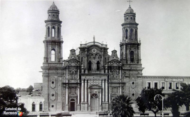 La imagen captura la grandiosidad de la Catedral de Hermosillo en una Ãpoca en la que la ciudad experimentaba cambios significativos. A travÃs de detalles arquitectÃnicos y el entorno urbano que la rodea, la fotografÃa transporta a los espectadores a una era marcada por la elegancia y la solemnidad de la arquitectura colonial.