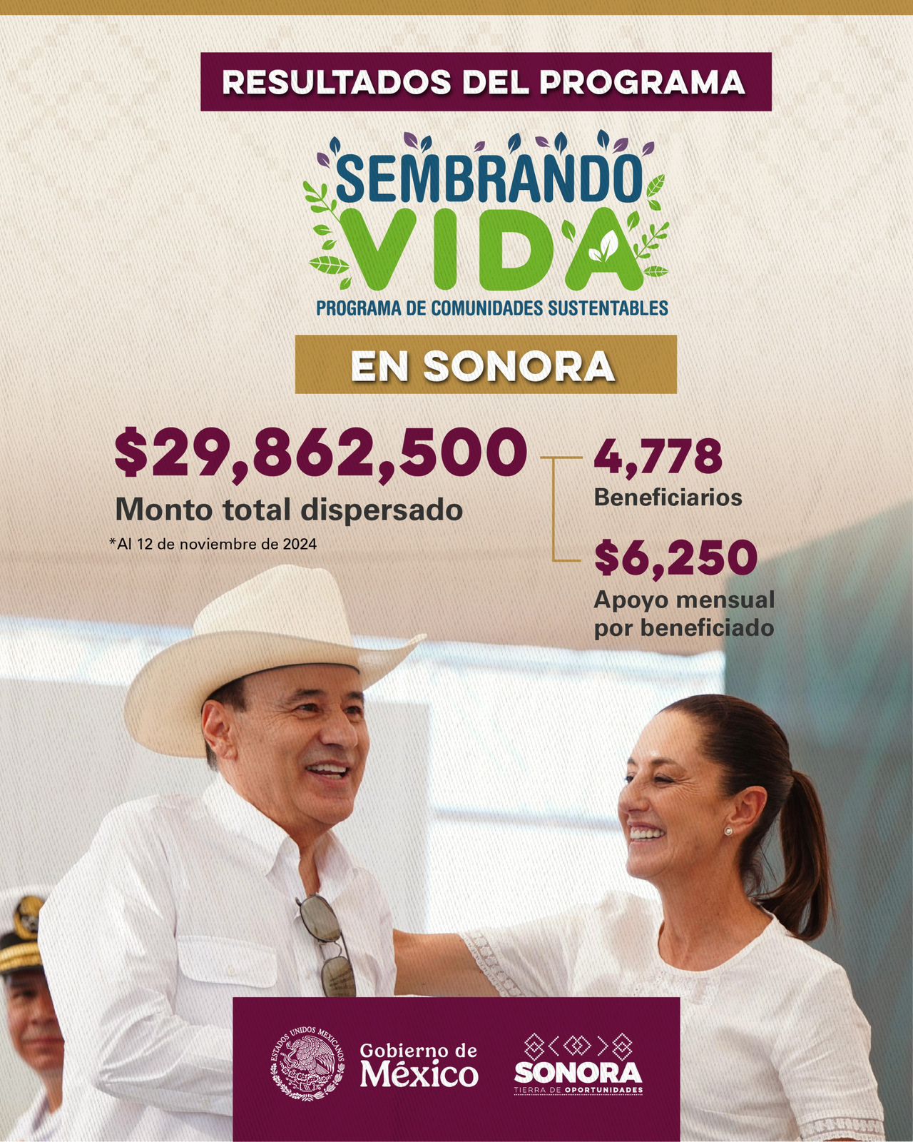 En coordinaciÃn con la visiÃn de la presidenta Claudia Sheinbaum, el programa âSembrando Vidaâ continÃa transformando las vidas de miles de familias sonorenses, brindando apoyo a quienes mÃs lo necesitan y fomentando el desarrollo sostenible en nuestras comunidades, destacà el gobernador Alfonso Durazo MontaÃo.