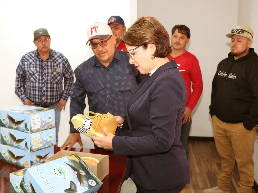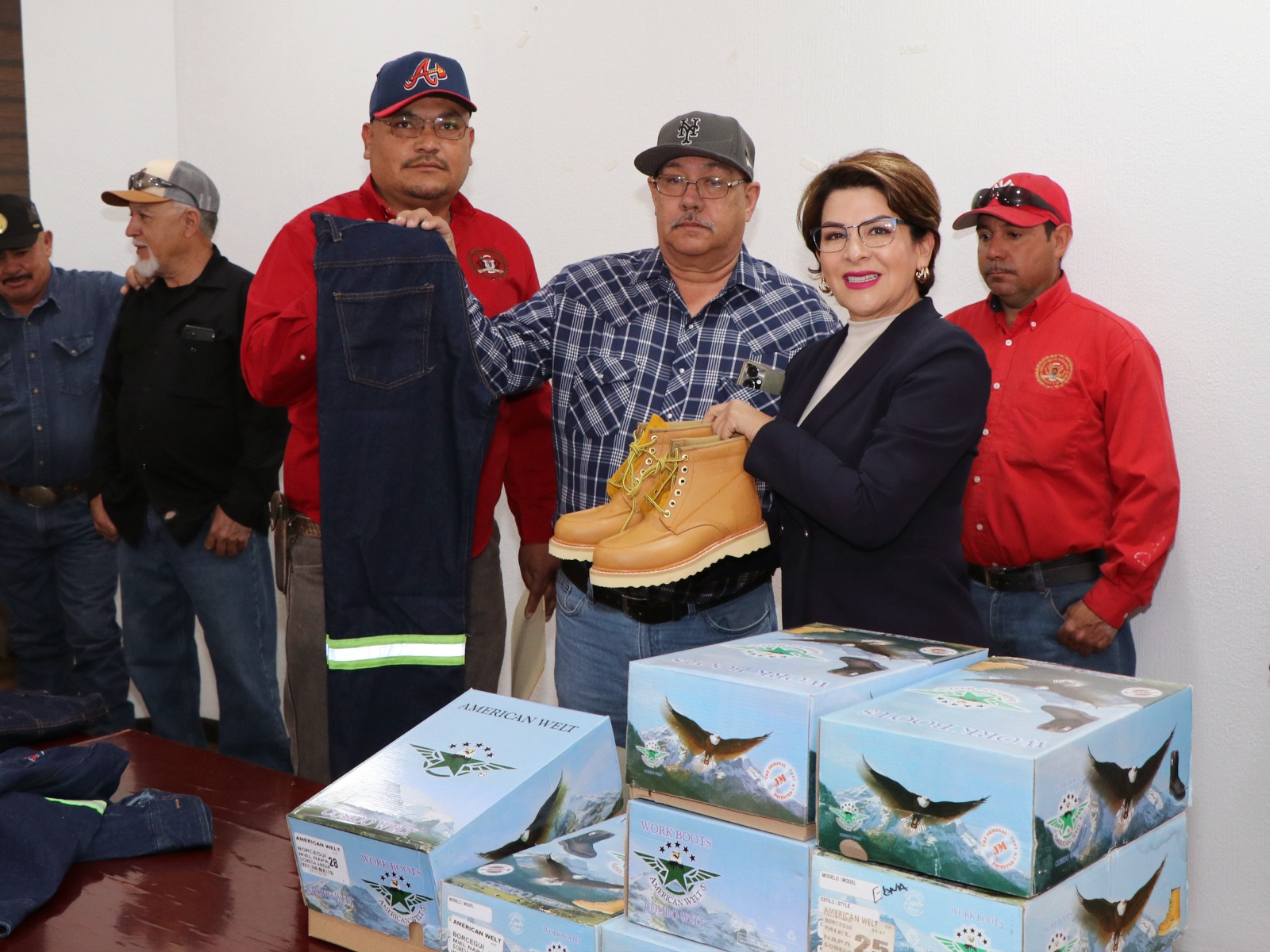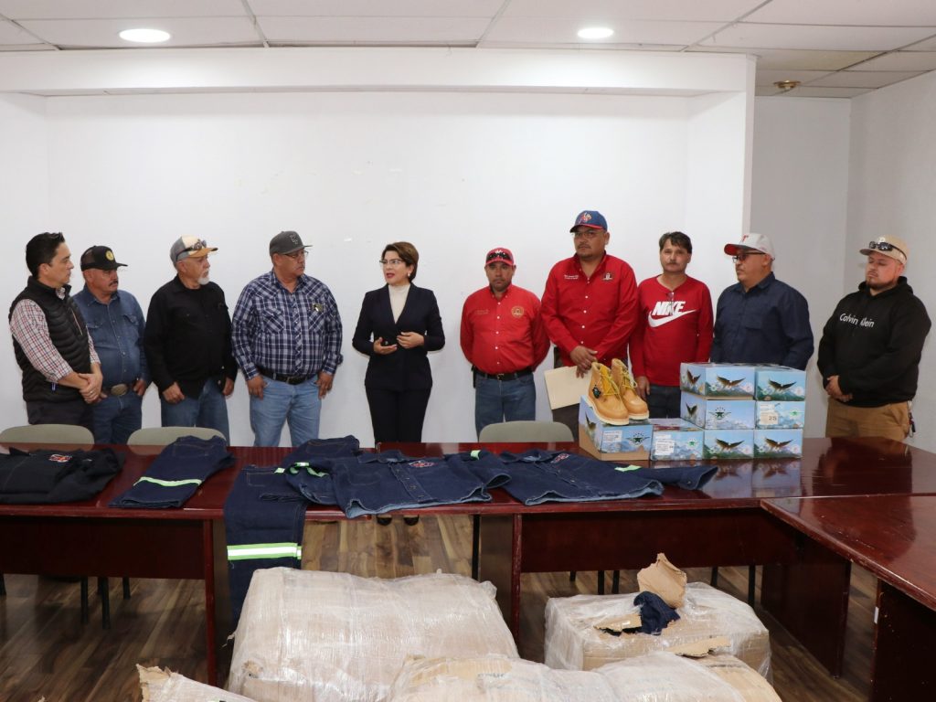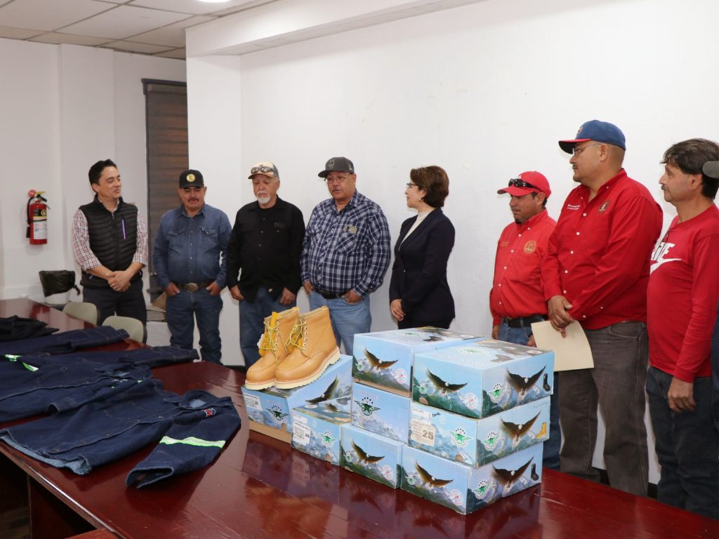 Como parte del cumplimiento a las clÃusulas del contrato colectivo, la alcaldesa de Cananea, Esmeralda GonzÃlez, realizà la entrega oficial de uniformes y calzado a trabajadores sindicalizados del Ayuntamiento.