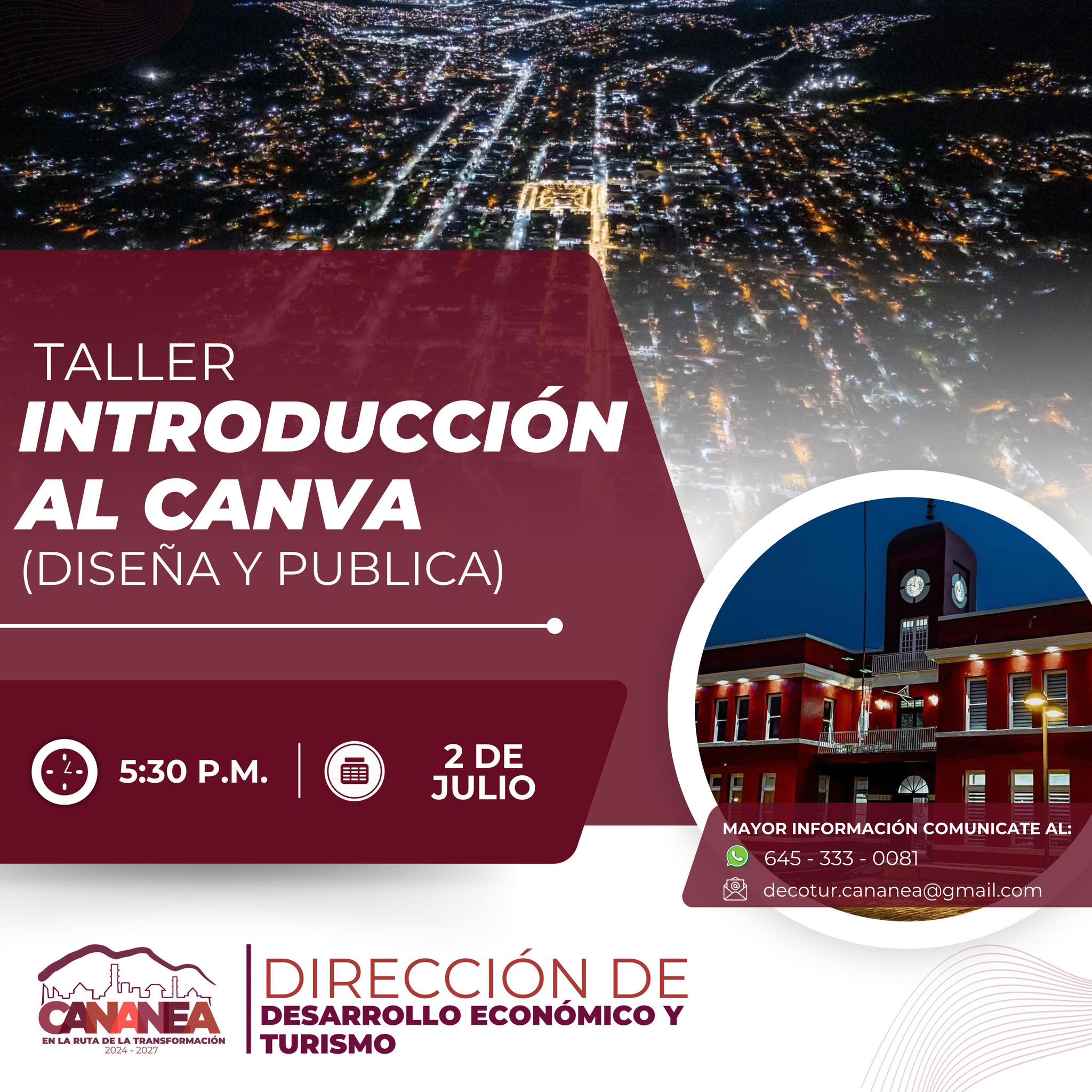 Con el objetivo de fortalecer las habilidades digitales de emprendedores, estudiantes y ciudadanÃa en general, el Gobierno Municipal de Cananea, a travÃs de la DirecciÃn de Desarrollo EconÃmico y Turismo, llevarà a cabo el taller gratuito âIntroducciÃn a Canva: DiseÃa y Publicaâ.