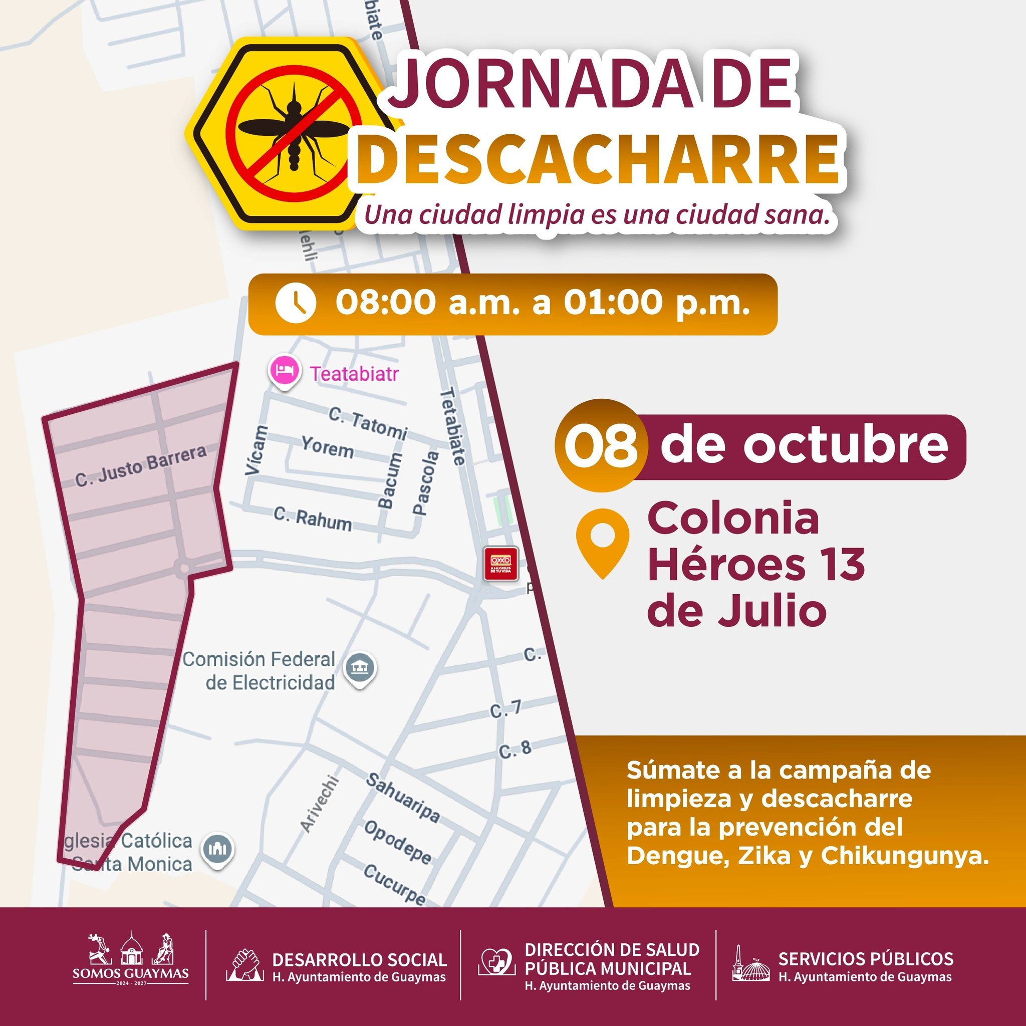 Guaymas, Sonora; 7 de octubre de 2025.â Con el propÃsito de prevenir enfermedades transmitidas por mosquitos como dengue, zika y chikungunya, el Ayuntamiento de Guaymas, a travÃs de Desarrollo Social, Salud PÃblica Municipal y Servicios PÃblicos, puso en marcha una jornada intensiva de descacharre del 6 al 10 de octubre en distintos sectores de la ciudad.