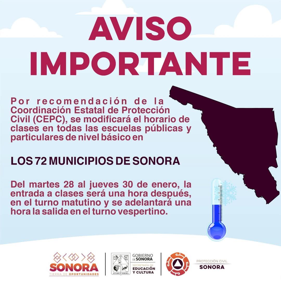 Debido a los pronÃsticos de bajas temperaturas, la CoordinaciÃn Estatal de ProtecciÃn Civil (CEPC) ha recomendado un cambio en los horarios de entrada a clases en el estado. Del martes 28 al jueves 30 de enero, todas las escuelas de nivel bÃsico, tanto pÃblicas como privadas, comenzarÃn una hora mÃs tarde en los turnos matutino y vespertino.