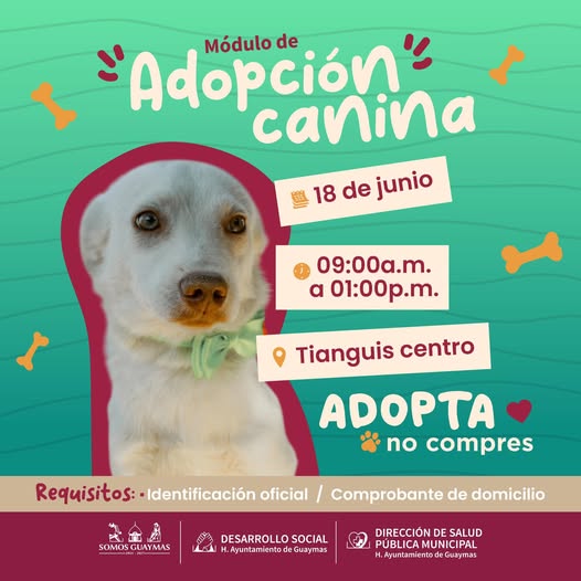El Ayuntamiento de Guaymas, a travÃs de la DirecciÃn de Salud PÃblica Municipal y Desarrollo Social, llevarà a cabo un MÃdulo de AdopciÃn Canina este 18 de junio en el tianguis del Centro. La actividad serà de 10:00 a.m. a 1:00 p.m.