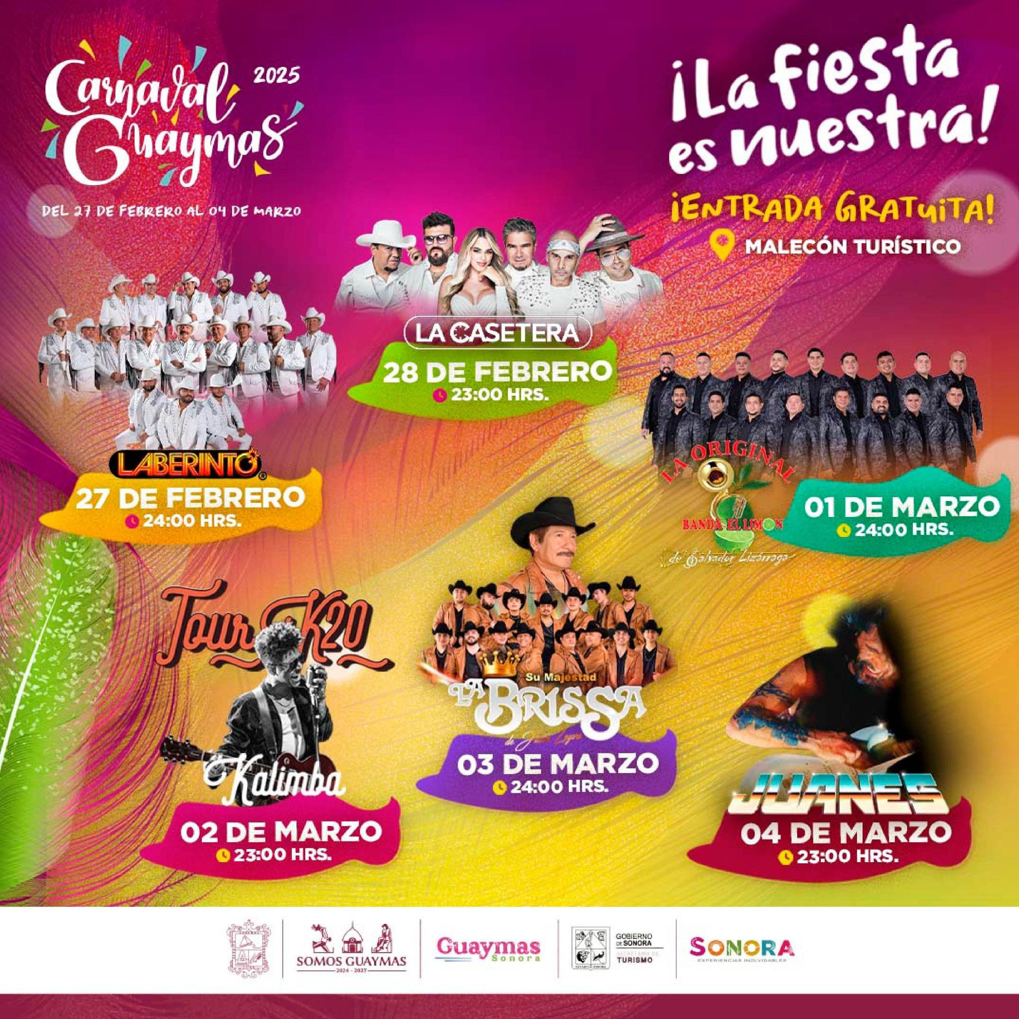 El Ayuntamiento de Guaymas, a travÃs de la DirecciÃn Municipal de Desarrollo EconÃmico y TurÃstico y la CoordinaciÃn de Festividades, presentà la esperada cartelera musical para el Carnaval 2025, que se llevarà a cabo del 27 de febrero al 4 de marzo. Artistas como Laberinto, Kalimba, La Original Banda El LimÃn y Juanes destacarÃn en el MalecÃn TurÃstico, ofreciendo un espectÃculo gratuito para los asistentes.
