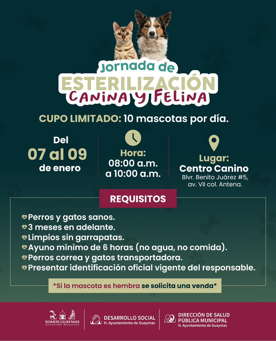Con el objetivo de fortalecer el bienestar animal, el Ayuntamiento de Guaymas, a travÃs de Desarrollo Social y Salud PÃblica Municipal, reactivà la jornada de esterilizaciÃn canina y felina en el municipio.