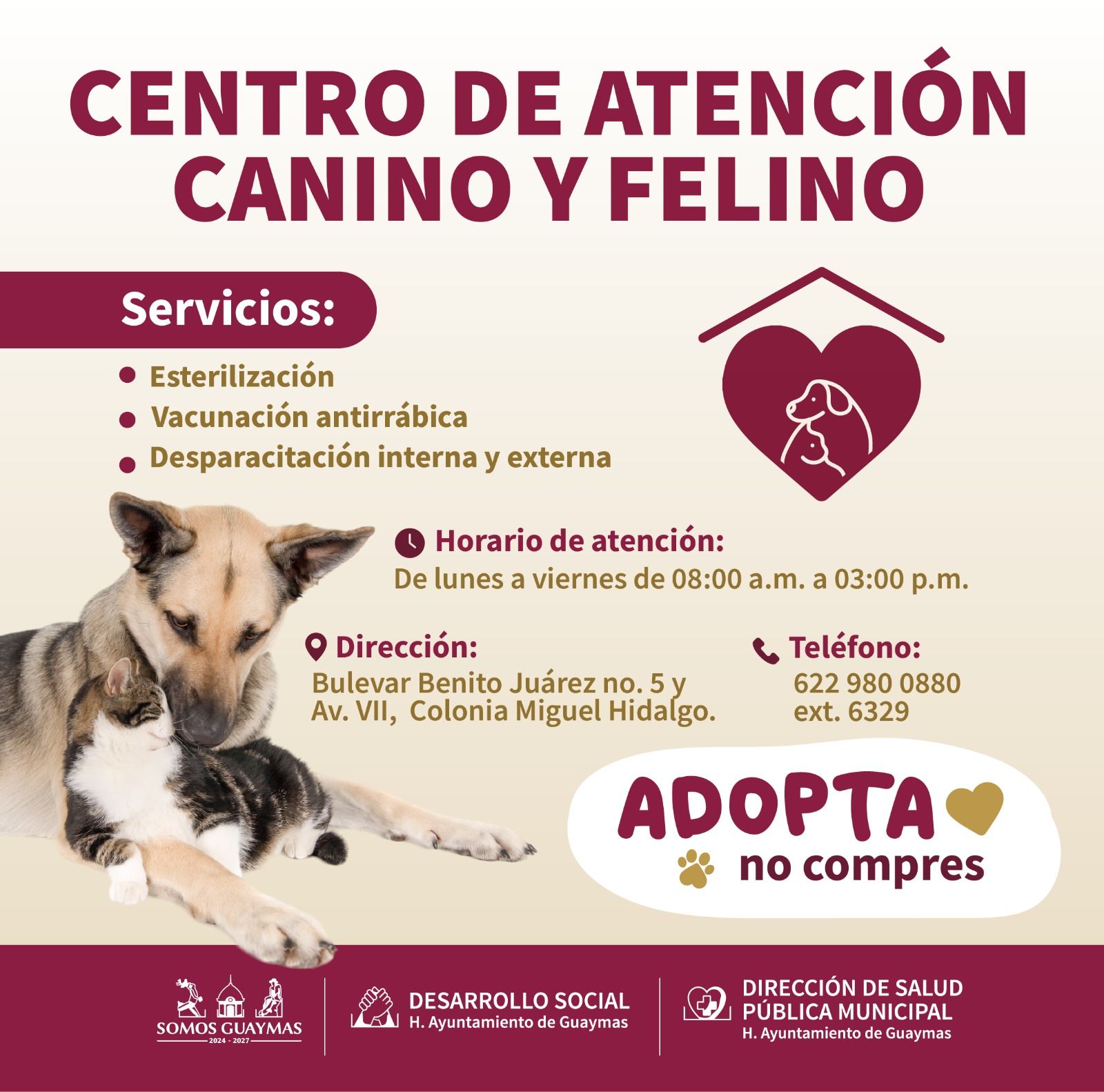 Guaymas ofrece atenciÃn gratuita para perros y gatos con el objetivo de prevenir enfermedades zoonÃticas. Los servicios estarÃn disponibles de lunes a viernes, de 8:00 a 15:00 horas, en el bulevar Benito JuÃrez. Para mÃs detalles, comunÃcate al 622 980 0880, ext. 6329.