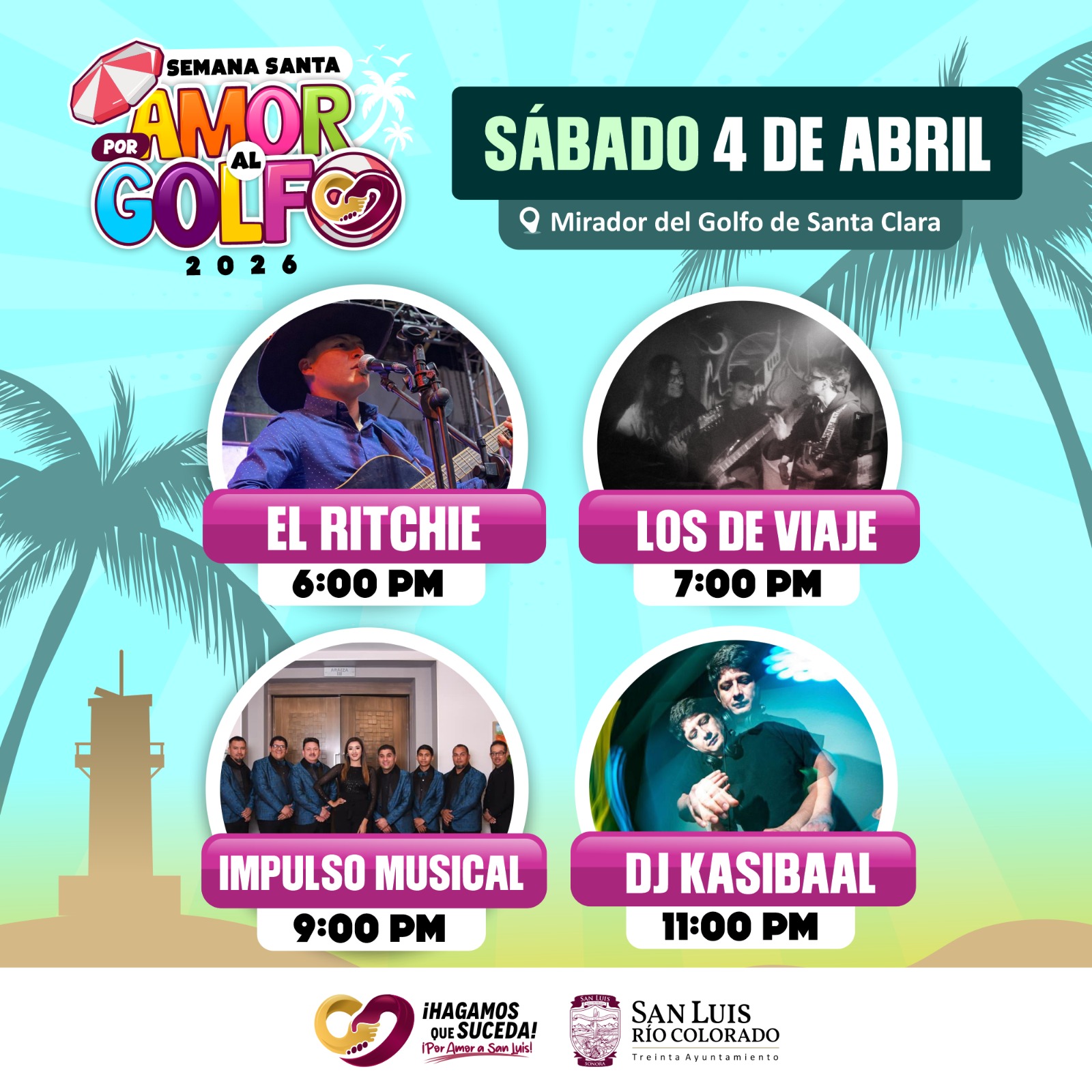San Luis RÃo Colorado, Sonora (30 de marzo de 2026).- Con el objetivo de ofrecer espacios de sana convivencia y fortalecer la actividad turÃstica en la regiÃn, el 30 Ayuntamiento de San Luis RÃo Colorado, a travÃs de la DirecciÃn de Desarrollo EconÃmico y PromociÃn TurÃstica, presenta la cartelera musical del evento âPor Amor al Golfoâ, que se llevarà a cabo el prÃximo 4 de abril en el Mirador del Golfo de Santa Clara, como parte de las actividades de Semana Santa.