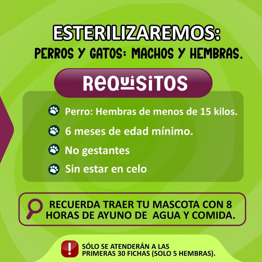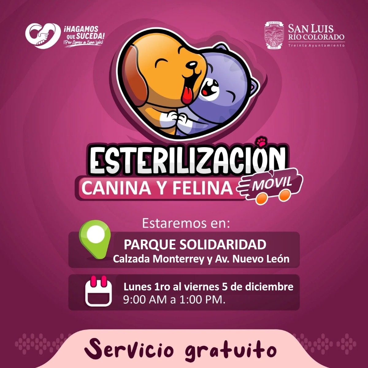 San Luis RÃo Colorado, Sonora.â A partir de este lunes 1 y hasta el viernes 5 de diciembre, el Ayuntamiento de San Luis RÃo Colorado intensifica sus acciones de control animal con una jornada de esterilizaciones gratuitas. Sin embargo, las autoridades de Salud PÃblica Municipal hacen un llamado a la ciudadanÃa para tomar precauciones: el servicio està limitado a solo 30 atenciones por dÃa.