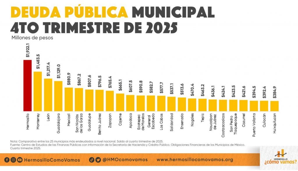 Hermosillo, Sonora; a 9 de abril de 2026. De acuerdo con las cifras oficiales del Centro de Estudios de las Finanzas Públicas al cierre del cuarto trimestre de 2025, Hermosillo encabeza la lista nacional de los municipios con mayor deuda pública, alcanzando la cifra de mil 922 millones de pesos. Aunque la capital sonorense no ha contratado créditos a largo plazo desde el año 2016, el uso recurrente de préstamos a corto plazo ha impedido que el saldo total disminuya de manera significativa, manteniendo una presión constante sobre las arcas municipales.
