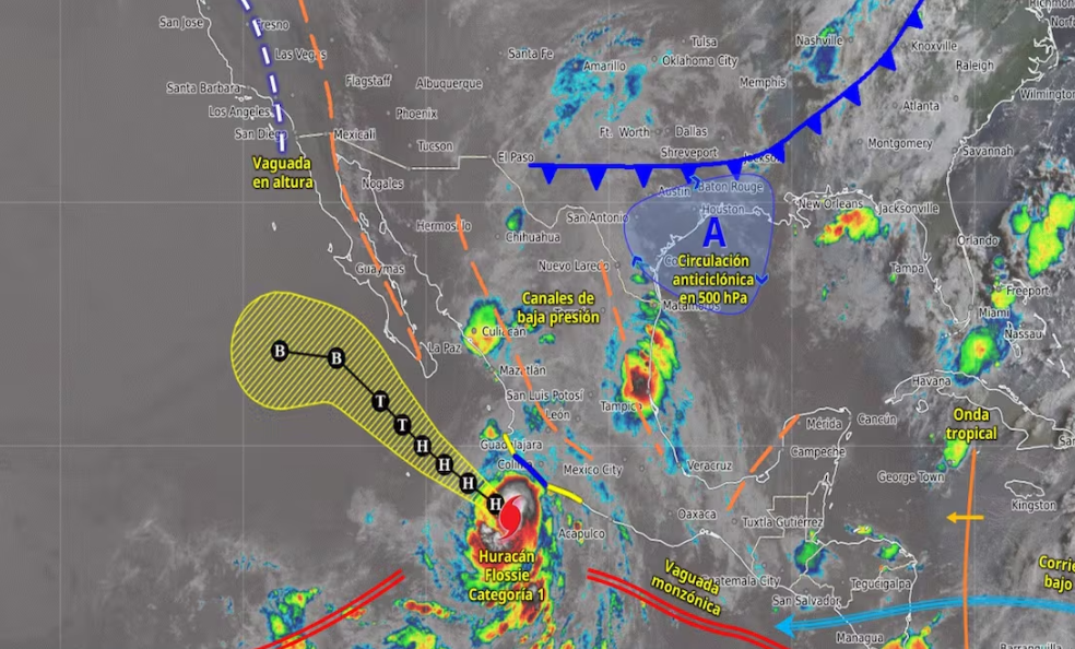 Con vientos sostenidos de hasta 175 km/h, Flossie se ubica a unos 445 km al sur-sureste de Cabo San Lucas y avanza en direcciÃn oeste-noroeste a 17 km/h. Aunque su trayectoria se mantiene en el mar, se espera que su influencia continÃe generando lluvias intensas, oleaje elevado y marejadas peligrosas frente a las costas mexicanas.