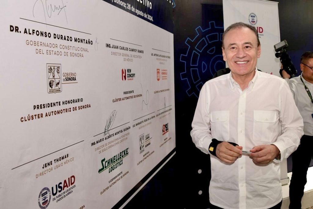 Hermosillo, Sonora; 27 de agosto de 2024.- En aras de fortalecer el desarrollo econÃmico y mantener el liderazgo de la entidad en la industria automotriz en la regiÃn fronteriza, el Gobernador Alfonso Durazo MontaÃo encabezà el lanzamiento y firma del acta constitutiva del ClÃster Automotriz de Sonora.