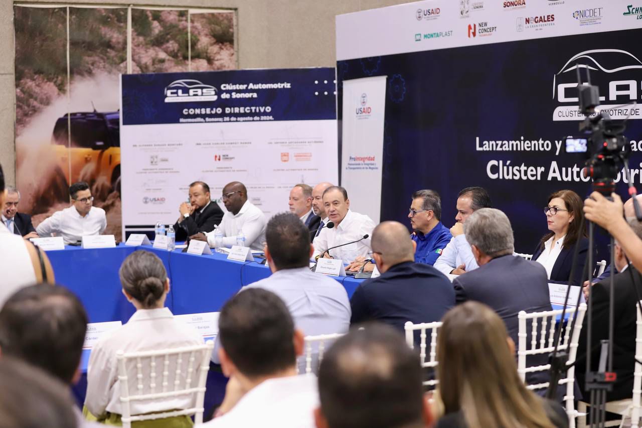 Hermosillo, Sonora; 27 de agosto de 2024.- En aras de fortalecer el desarrollo econÃmico y mantener el liderazgo de la entidad en la industria automotriz en la regiÃn fronteriza, el Gobernador Alfonso Durazo MontaÃo encabezà el lanzamiento y firma del acta constitutiva del ClÃster Automotriz de Sonora.
