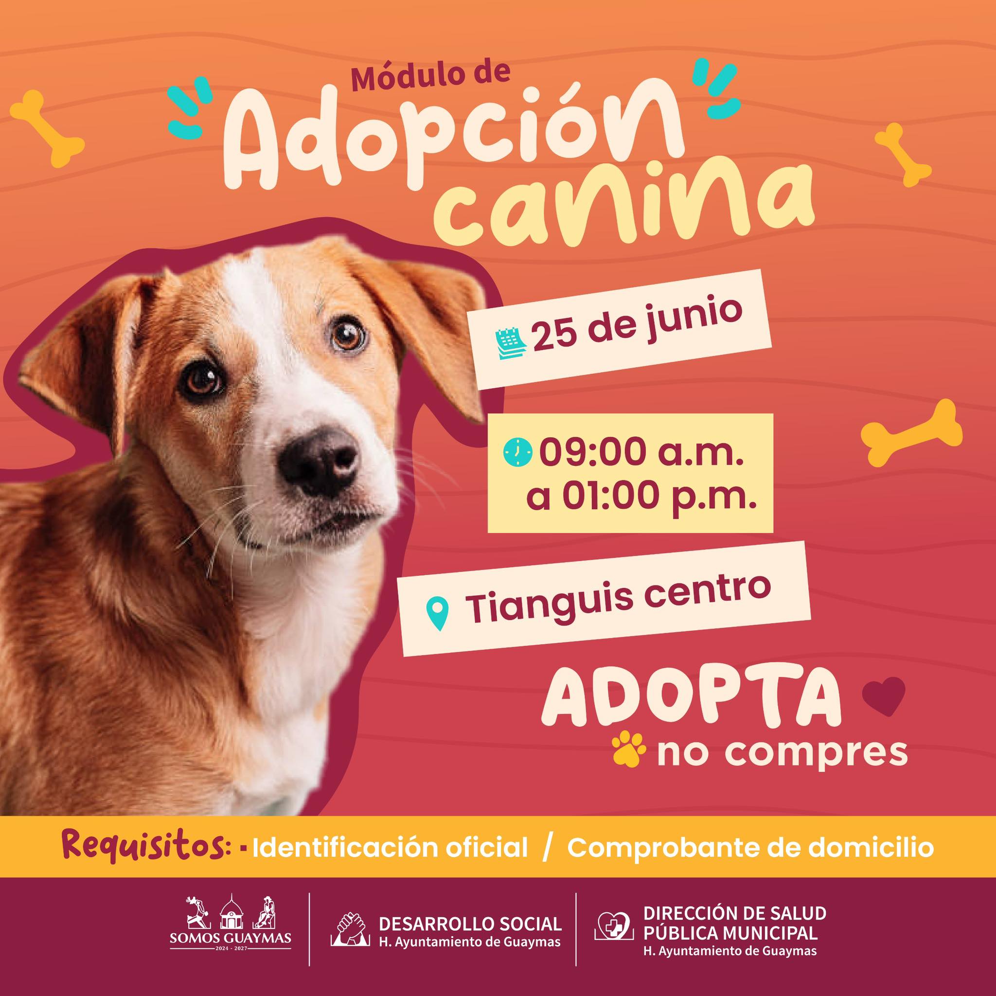El Ayuntamiento de Guaymas 2024â2027, a travÃs de la DirecciÃn de Salud PÃblica Municipal y Desarrollo Social, instalarà este miÃrcoles 25 de junio un MÃdulo de AdopciÃn Canina en el tianguis del Centro.