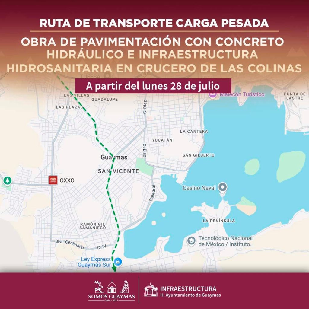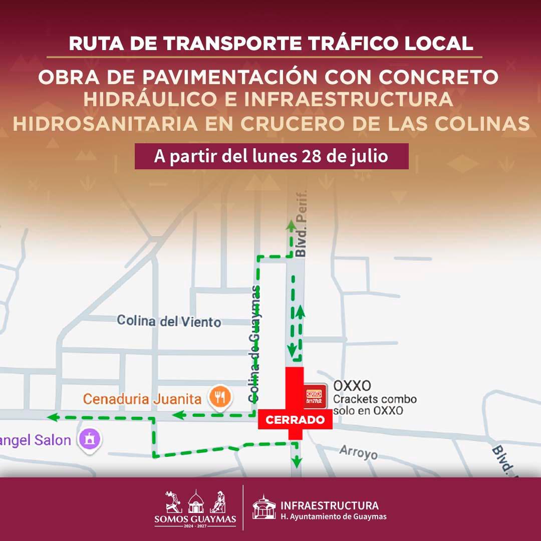 Desde este lunes 28 de julio, el H. Ayuntamiento de Guaymas ha comenzado la obra de pavimentaciÃn con concreto hidrÃulico y la mejora de la infraestructura hidrosanitaria en el crucero de Las Colinas, un punto clave para el trÃnsito local y de carga en la ciudad.
