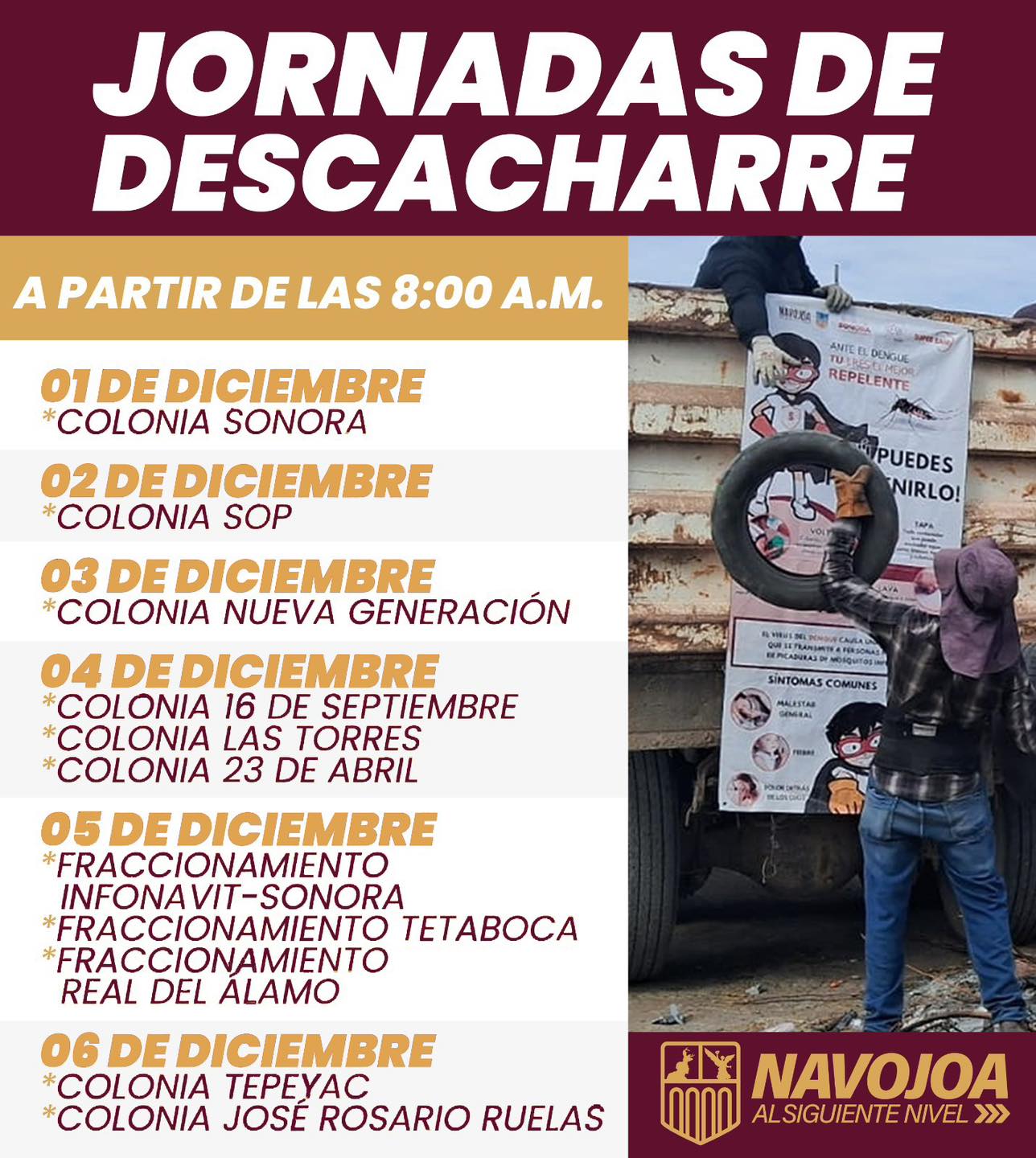 Navojoa, Sonora.â Con el objetivo prioritario de frenar la reproducciÃn del mosquito transmisor de enfermedades, el Ayuntamiento de Navojoa ha reforzado sus jornadas de descacharre en diversos sectores de la ciudad. Las brigadas de limpieza inician recorridos a partir de las 8:00 de la maÃana, enfocÃndose en retirar objetos que acumulan agua y se convierten en focos de infecciÃn.