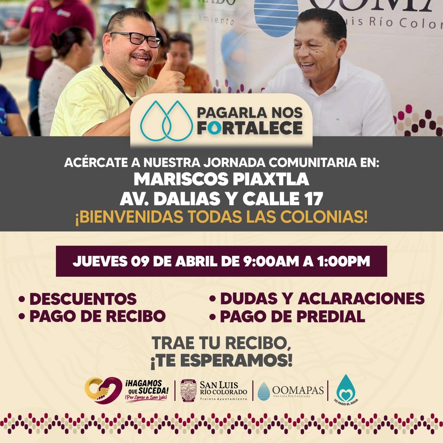 San Luis Río Colorado, Sonora (Abril 07 de 2026).- Con el objetivo de acercar los servicios municipales y brindar una atención cercana, ágil y oportuna a la comunidad, el 30 Ayuntamiento, a través del Organismo Operador Municipal de Agua Potable, Alcantarillado y Saneamiento (OOMAPAS), invita a la ciudadanía a participar en la jornada “Pagarla Nos Fortalece”.