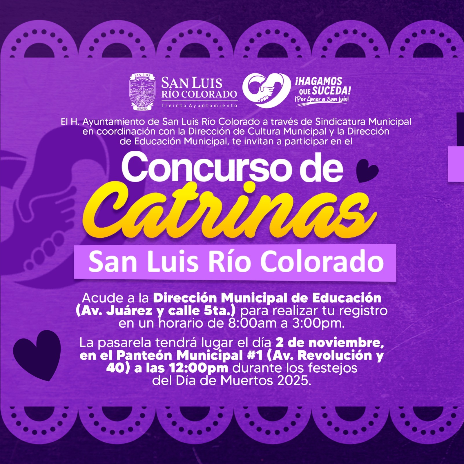 San Luis RÃo Colorado, Sonora (Octubre 31 de 2025).- En el marco de las celebraciones de DÃa de Muertos, el 30 Ayuntamiento, a travÃs de Sindicatura Municipal, en coordinaciÃn con la DirecciÃn de Cultura y la DirecciÃn de EducaciÃn Municipal, invita a la ciudadanÃa a participar en el Concurso de Catrinas 2025.