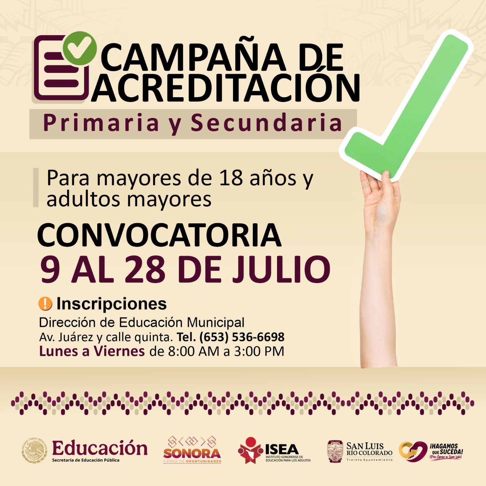 Con el objetivo de brindar oportunidades educativas a quienes no concluyeron su educaciÃn bÃsica, el 30 Ayuntamiento de San Luis RÃo Colorado, a travÃs de la DirecciÃn de EducaciÃn Municipal en coordinaciÃn con el Instituto Sonorense de EducaciÃn para los Adultos (ISEA), invita a todas las personas mayores de 18 aÃos a participar en la campaÃa de acreditaciÃn de estudios de nivel Primaria y Secundaria.