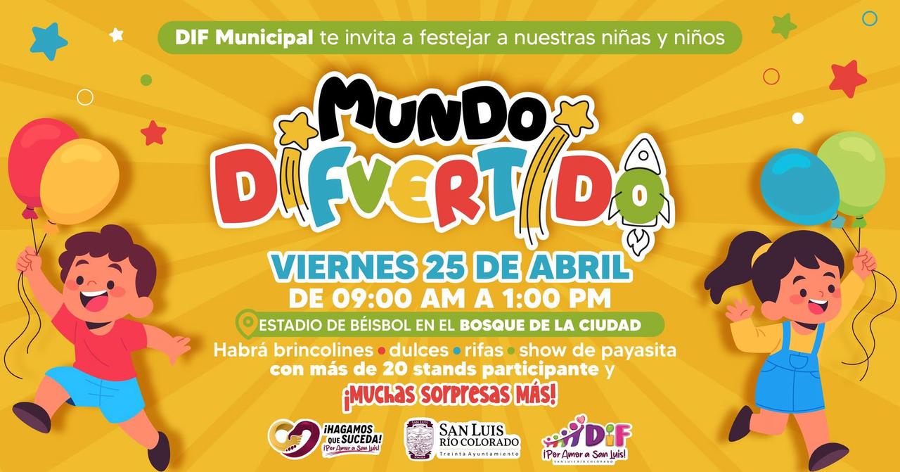 San Luis RÃo Colorado, Sonora (Abril 24 de 2025).- Como parte de los festejos del DÃa del NiÃo, el 30 Ayuntamiento a travÃs de DIF Municipal hace una invitaciÃn abierta a la ciudadanÃa a formar parte del gran cierre de âMundo DIFvertidoâ este viernes 25 de abril en el Nuevo Estadio de BÃisbol del Bosque de la Ciudad.