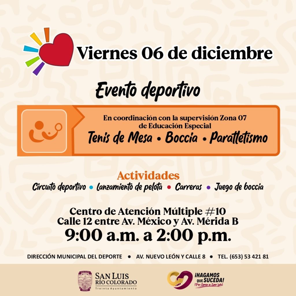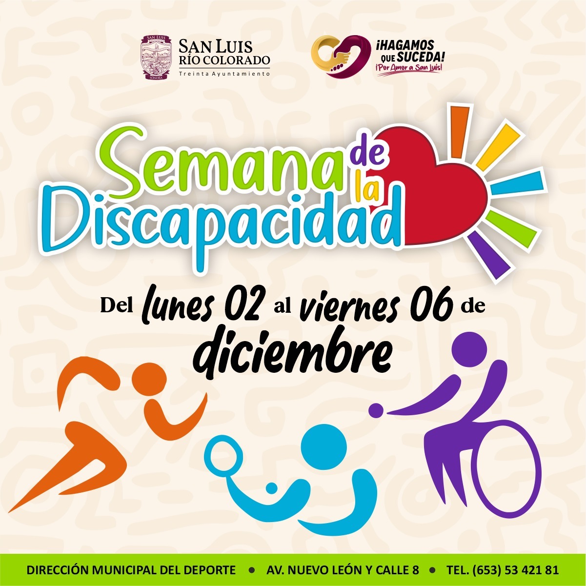 San Luis RÃo Colorado, Sonora (Noviembre 29 de 2024).- Para concientizar y generar espacios de visibilidad a las personas con discapacidad de nuestra comunidad, el 30 Ayuntamiento a travÃs de la DirecciÃn de Deporte Municipal invita a participar en los eventos de la âSemana de la Discapacidadâ.