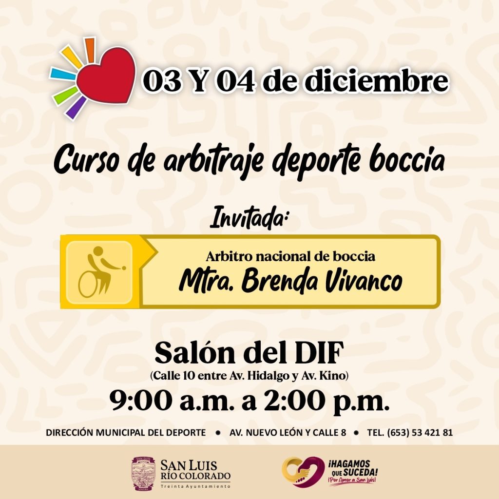 El martes 03 y miÃrcoles 04 nuevamente en el SalÃn DIF (Av. Hidalgo y 10) se brindarà un curso de arbitraje de boccia impartido por Brenda Vivanco, quien es Ãrbitra nacional de este popular deporte paralÃmpico, finalmente, el viernes 06 se llevarà a cabo un evento deportivo en el CAM #10 (Av. MÃxico y 12) en donde los participantes podrÃn realizar tenis de mesa, boccia, paratletismo, lanzamiento de pelota, carreras, entre otros.