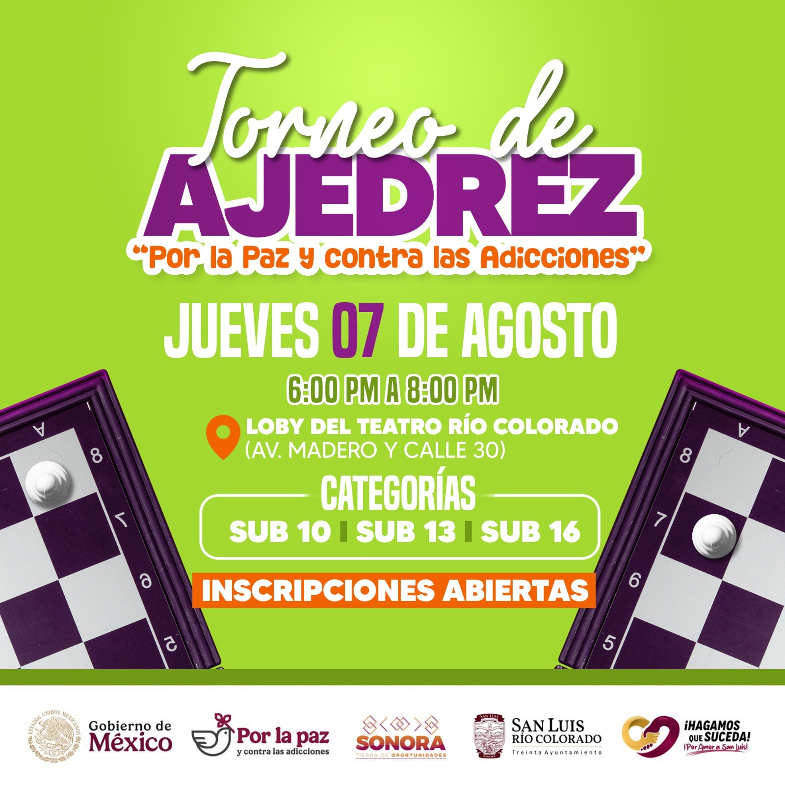 San Luis RÃo Colorado, Sonora (Agosto 06 de 2025). – Con el objetivo de incentivar la prÃctica del deporte-ciencia entre niÃas, niÃos y adolescentes, el 30 Ayuntamiento de San Luis RÃo Colorado, a travÃs de la DirecciÃn Municipal de Cultura, invita a toda la comunidad a participar en el Torneo de Ajedrez que se llevarà a cabo este jueves 07 de agosto a partir de las 6:00 de la tarde en el lobby del Teatro RÃo Colorado (Av. Madero y 30).