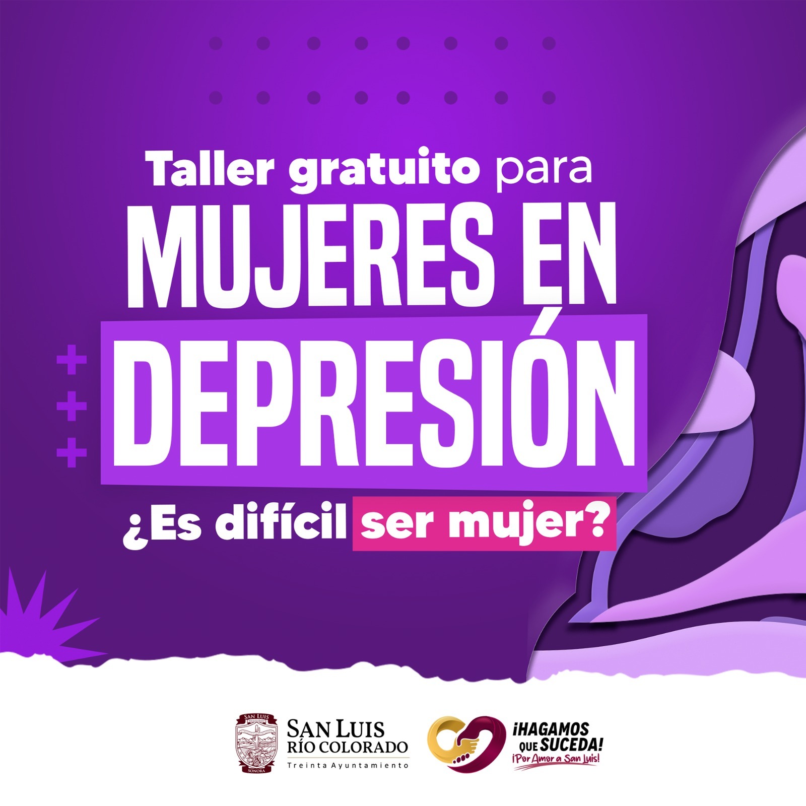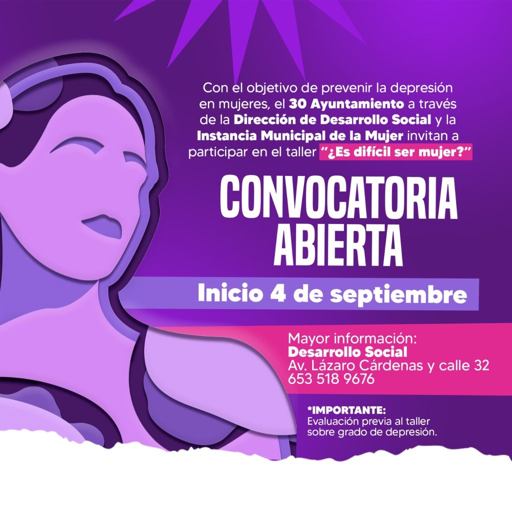 San Luis RÃo Colorado, Sonora (Agosto 20 de 2025).- Con el objetivo de prevenir la depresiÃn en mujeres, el 30 Ayuntamiento, a travÃs de la DirecciÃn de Desarrollo Social y la Instancia Municipal de la Mujer, invita a participar en el taller gratuito âÂEs difÃcil ser mujer?â, que darà inicio el prÃximo 04 de septiembre.