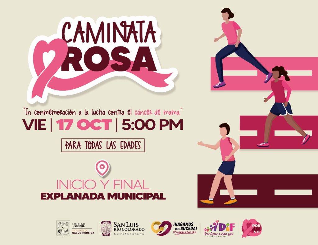 San Luis RÃo Colorado, Sonora (Octubre 13 de 2025).- En el marco de la conmemoraciÃn de la lucha contra el cÃncer de mama, DIF Municipal extendià la invitaciÃn a la comunidad para sumarse a la Caminata Rosa âPor Amor a tu Saludâ, que se llevarà a cabo el prÃximo viernes 17 de octubre a las 5:00 de la tarde.