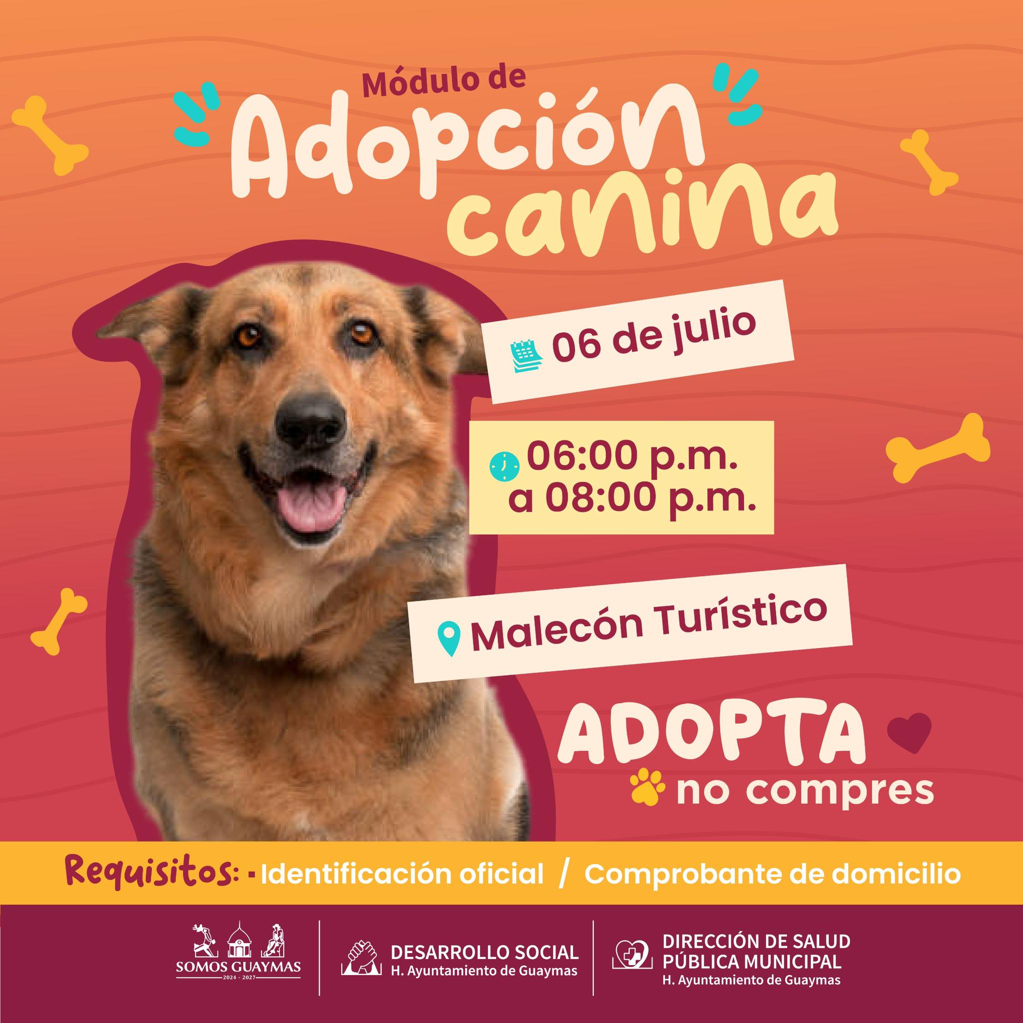El H. Ayuntamiento de Guaymas, a travÃs de las direcciones de Desarrollo Social y Salud PÃblica Municipal, invita a la ciudadanÃa al MÃdulo de AdopciÃn Canina este domingo 6 de julio.