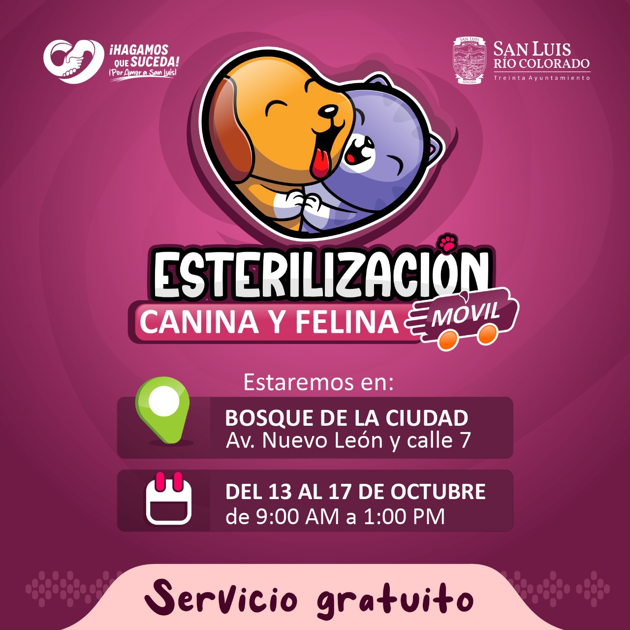 San Luis RÃo Colorado, Sonora (13 de octubre de 2025).- El 30 Ayuntamiento, a travÃs de la DirecciÃn de Salud PÃblica Municipal, invita a la comunidad a aprovechar la jornada de EsterilizaciÃn Canina y Felina MÃvil, que se realizarà de manera gratuita del lunes 13 al viernes 17 de octubre en el Bosque de la Ciudad (Av. Nuevo LeÃn y calle 7).