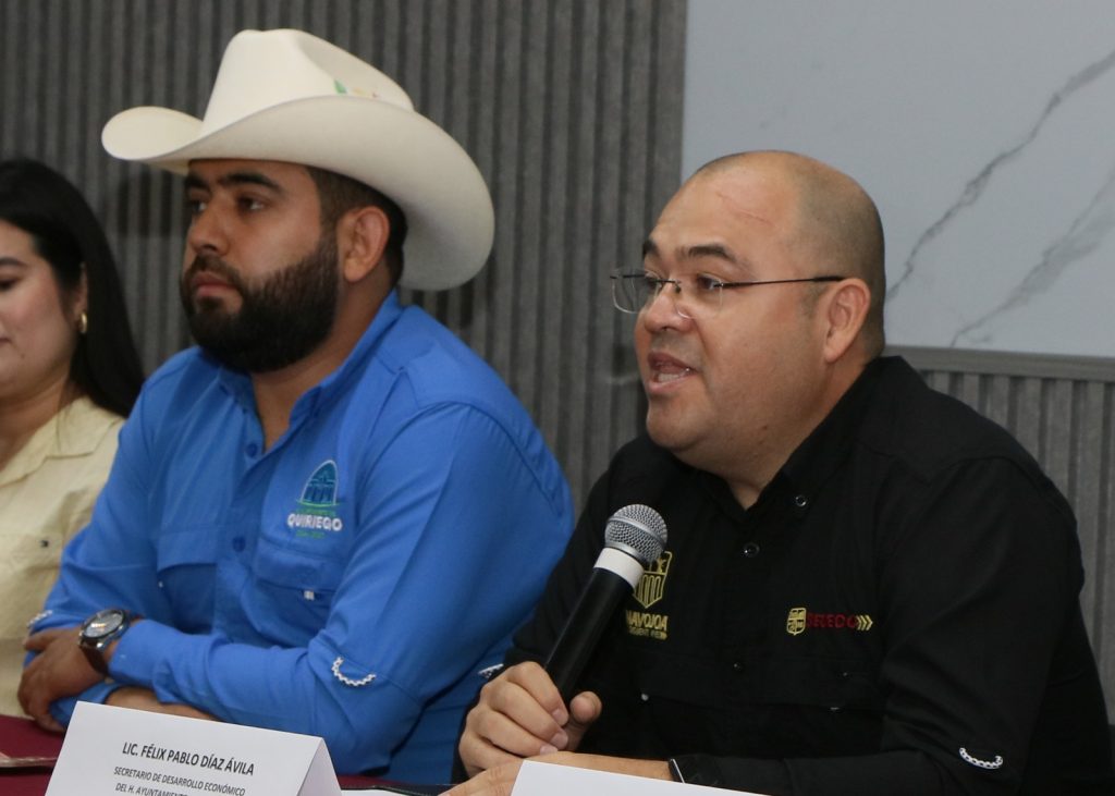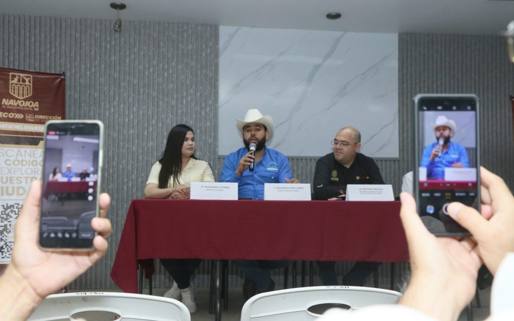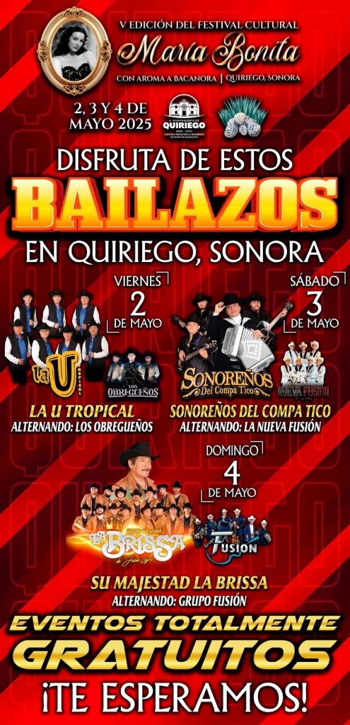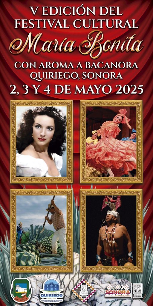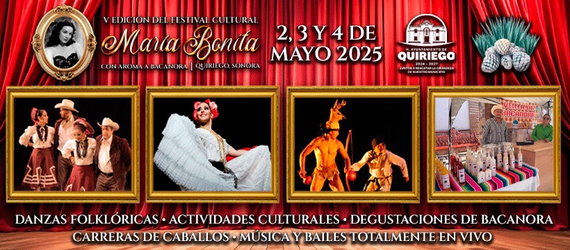Navojoa, Sonora, 28 de abril 2025.- Con un atractivo programa artÃstico, exposiciones, vendimias, carreras de caballos, callejoneadas, cabalgata y magnos bailes populares, tendrà lugar del 2 al 4 de mayo en Quiriego el Quinto Festival Cultural âMarÃa Bonita, con aroma a Bacanoraâ, evento al que invità hoy el alcalde de dicho municipio, Fredi Renato Flores Campos, a todos los habitantes del sur de Sonora, contando con el apoyo logÃstico del ayuntamiento de Navojoa.