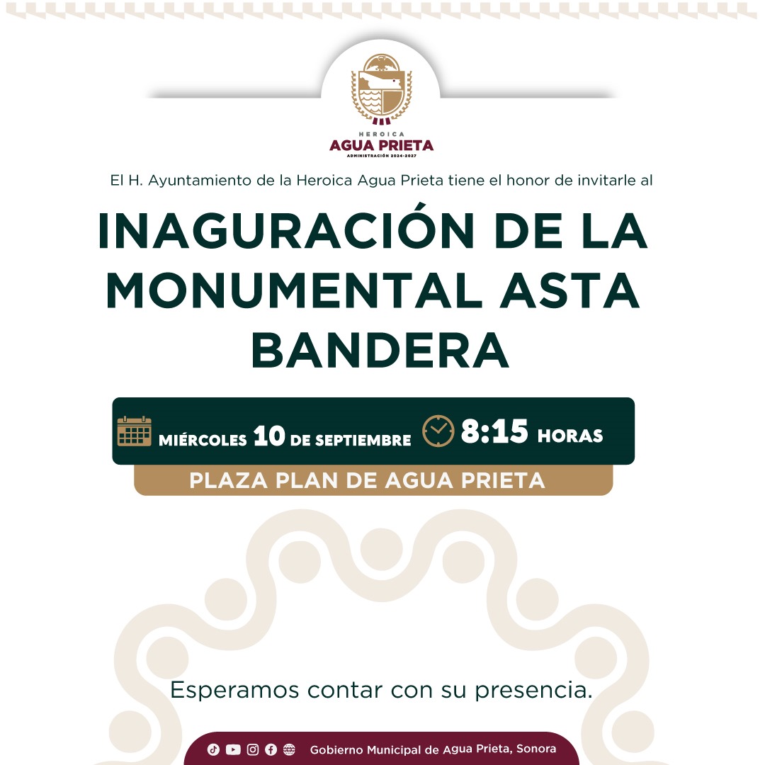 Agua Prieta, Sonora; 9 de septiembre de 2025.- El Ayuntamiento de Agua Prieta invita a la ciudadanÃa a participar en la inauguraciÃn de la Monumental Asta Bandera, un evento cÃvico que se llevarà a cabo este miÃrcoles en la Plaza Plan de Agua Prieta a las 8:15 de la maÃana.