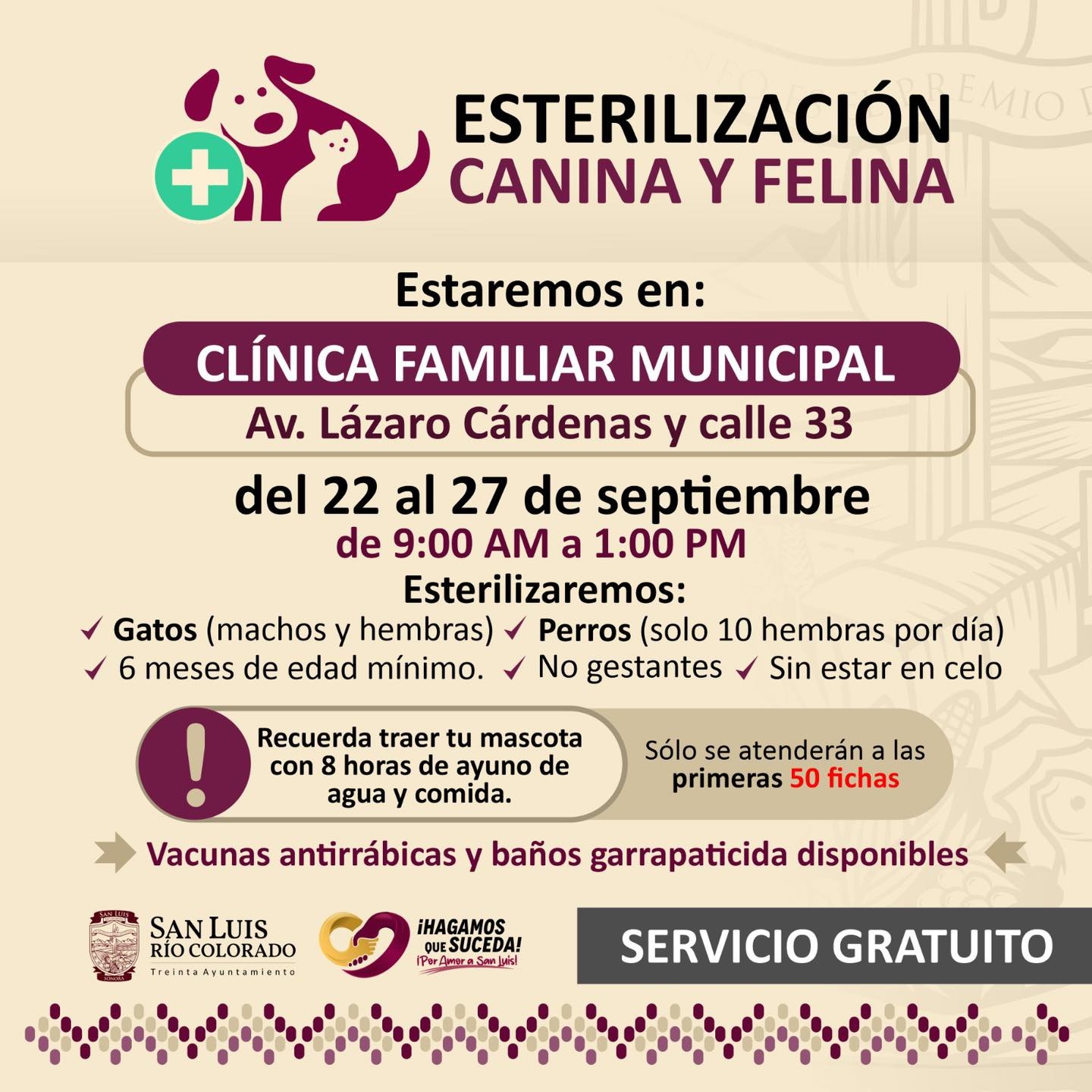 San Luis RÃo Colorado, Sonora.- Para fomentar el bienestar animal, prevenir riesgos sanitarios y promover la tenencia responsable, el 30 Ayuntamiento a travÃs de la DirecciÃn de Salud PÃblica Municipal invita a la ciudadanÃa a participar en la campaÃa gratuita de esterilizaciÃn canina y felina, que se realizarà el viernes 26 y sÃbado 27 de septiembre en la ClÃnica Familiar Municipal, ubicada en Av. LÃzaro CÃrdenas y Calle 33, de 9:00 a.m. a 1:00 p.m.