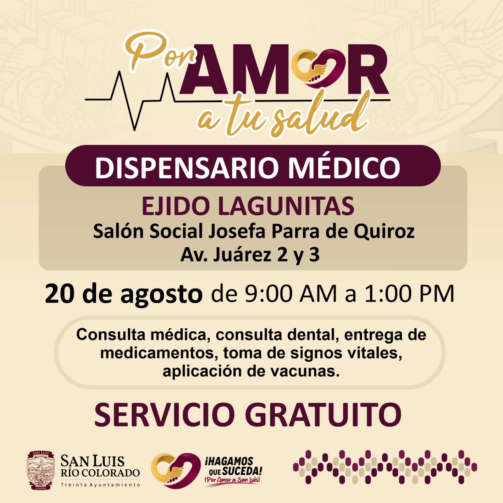 San Luis RÃo Colorado, Sonora (Julio 30 de 2025).- Con el objetivo de acercar servicios mÃdicos bÃsicos a las familias sanluisinas que residen en el valle, este prÃximo miÃrcoles 20 de agosto el 30 Ayuntamiento de San Luis RÃo Colorado, a travÃs de la DirecciÃn de Salud PÃblica Municipal, llevarà a cabo una jornada gratuita de atenciÃn en el Dispensario MÃdico del ejido Lagunitas.