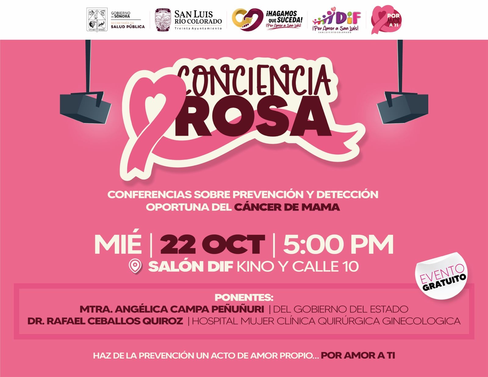 San Luis RÃo Colorado, Sonora (22 de octubre de 2025).- En el marco de las actividades del Mes de PrevenciÃn y DetecciÃn Oportuna del CÃncer de Mama y CÃrvico-Uterino, el 30 Ayuntamiento, a travÃs del DIF Municipal, reiterà la invitaciÃn a la comunidad a asistir al ciclo de conferencias âConciencia Rosaâ, que se llevarà a cabo este miÃrcoles 22 de octubre en el salÃn DIF (Av. Kino y calle 10) en punto de las 5:00 p.m.