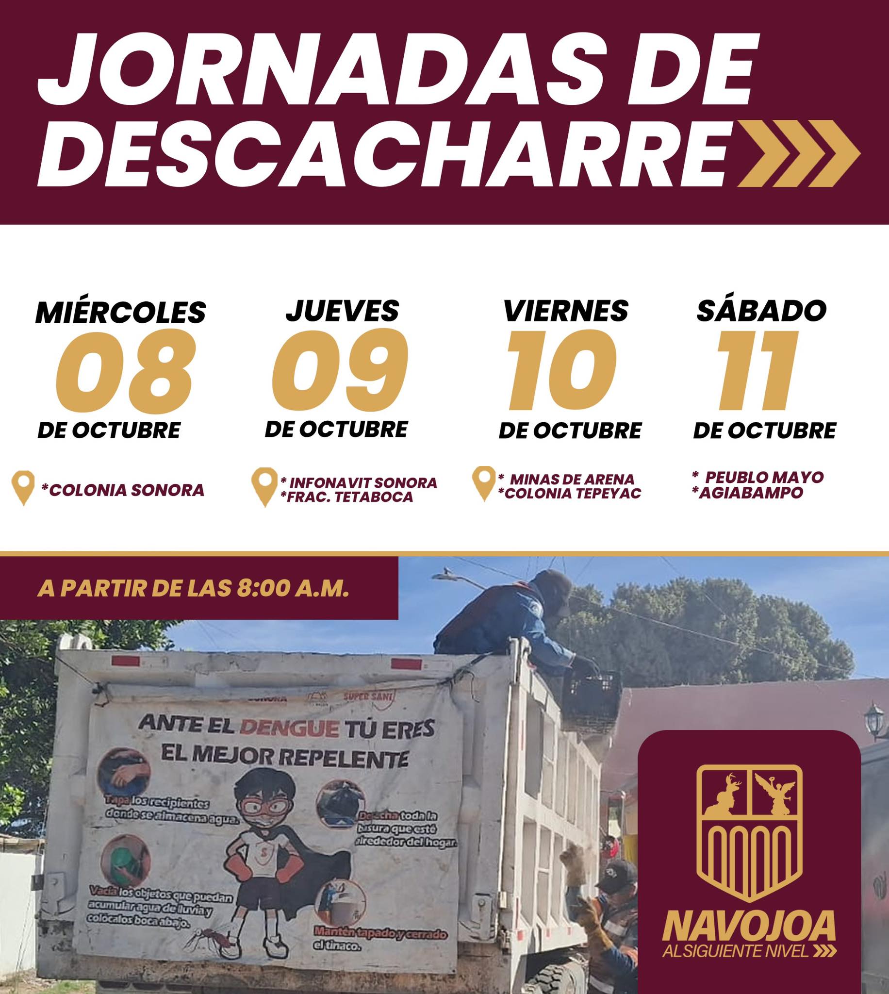 Navojoa, Sonora; a 10 de Octubre del 2025.- Con el propÃsito de eliminar criaderos del mosquito transmisor del dengue, el Gobierno Municipal de Navojoa convocà a la poblaciÃn a participar en la Jornada de Descacharre este viernes 10 y sÃbado 11 de octubre, en distintos puntos de la ciudad.