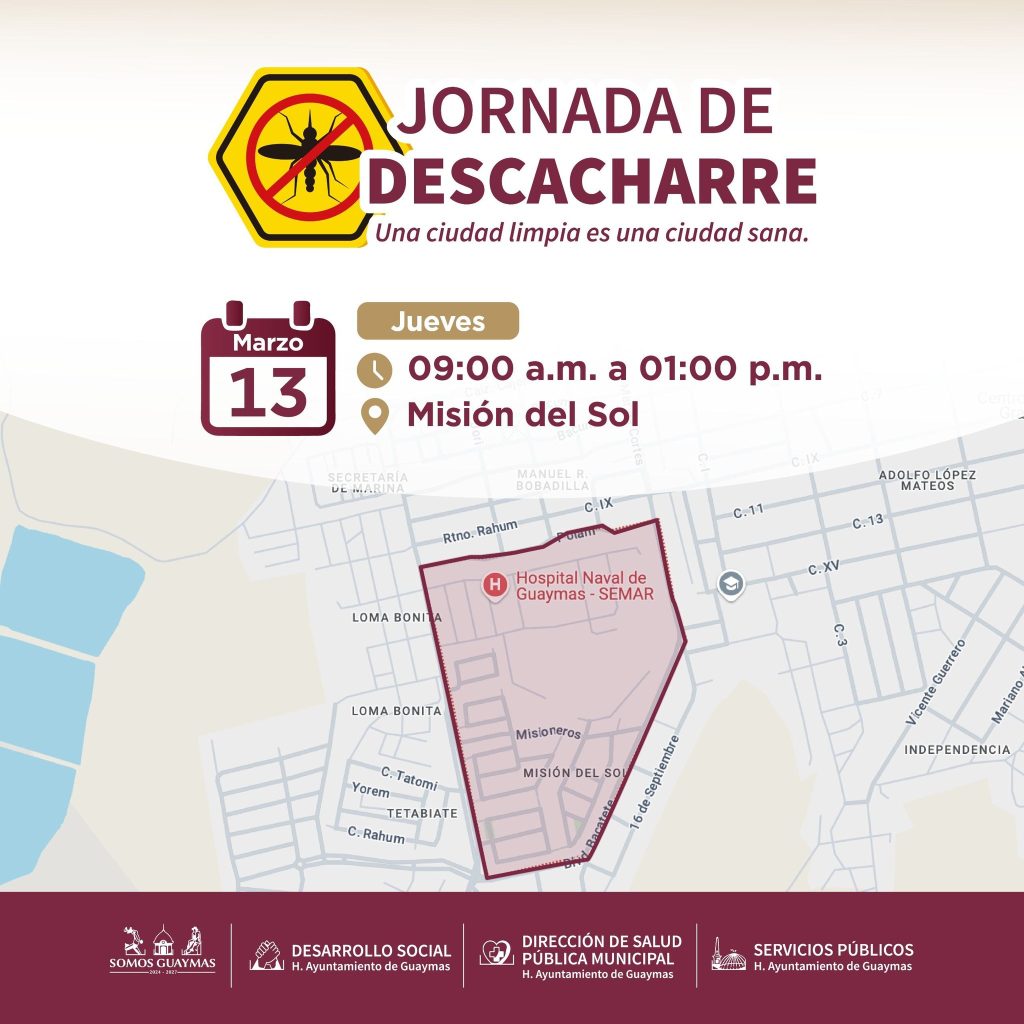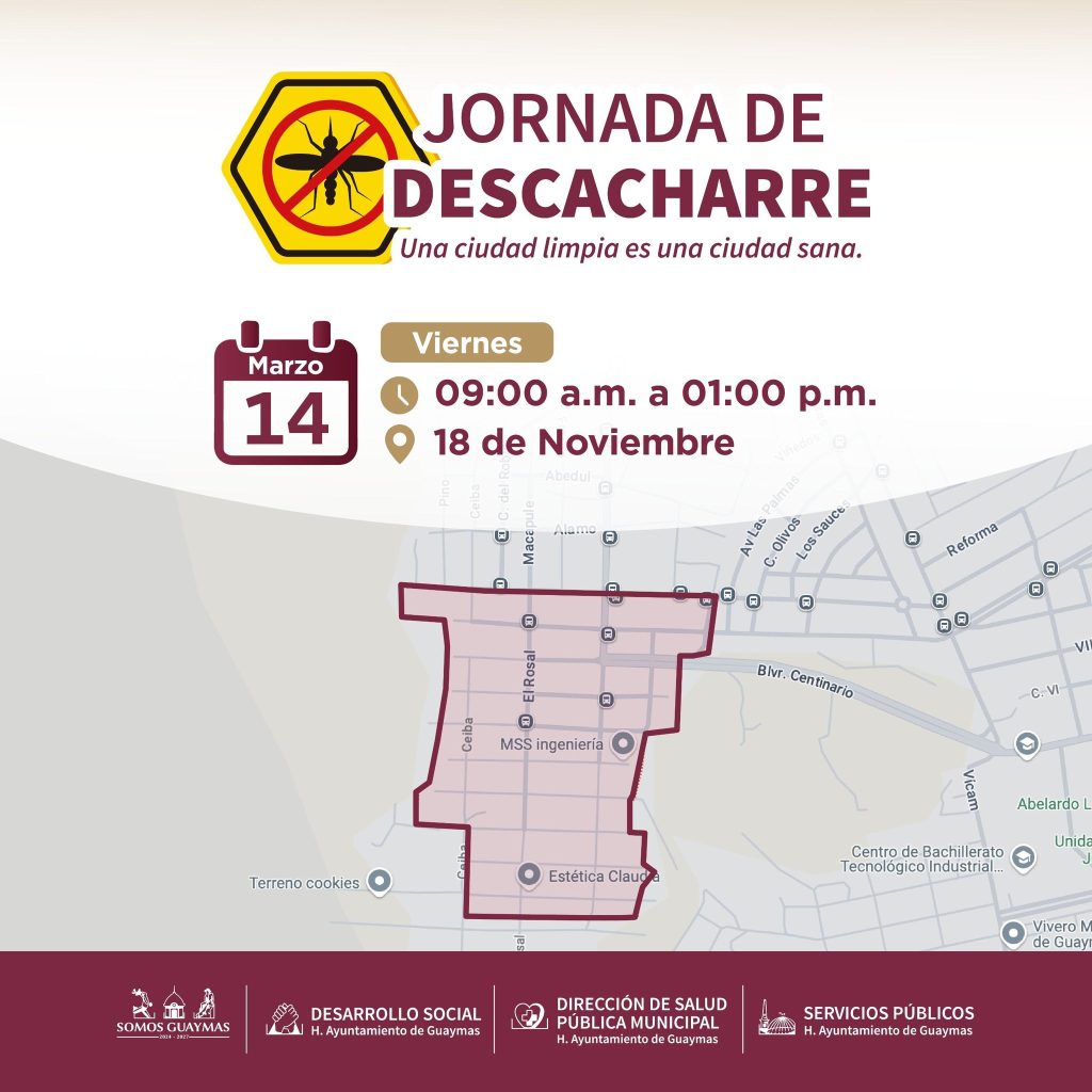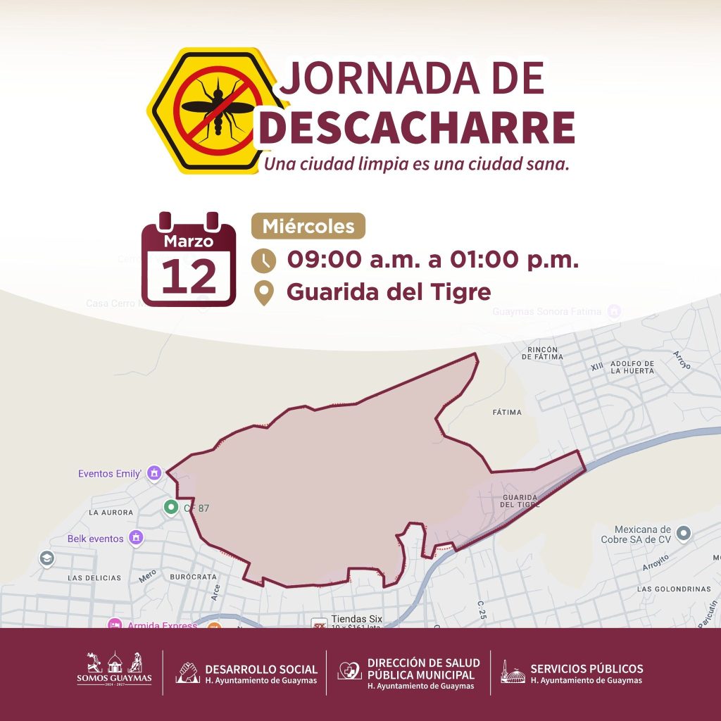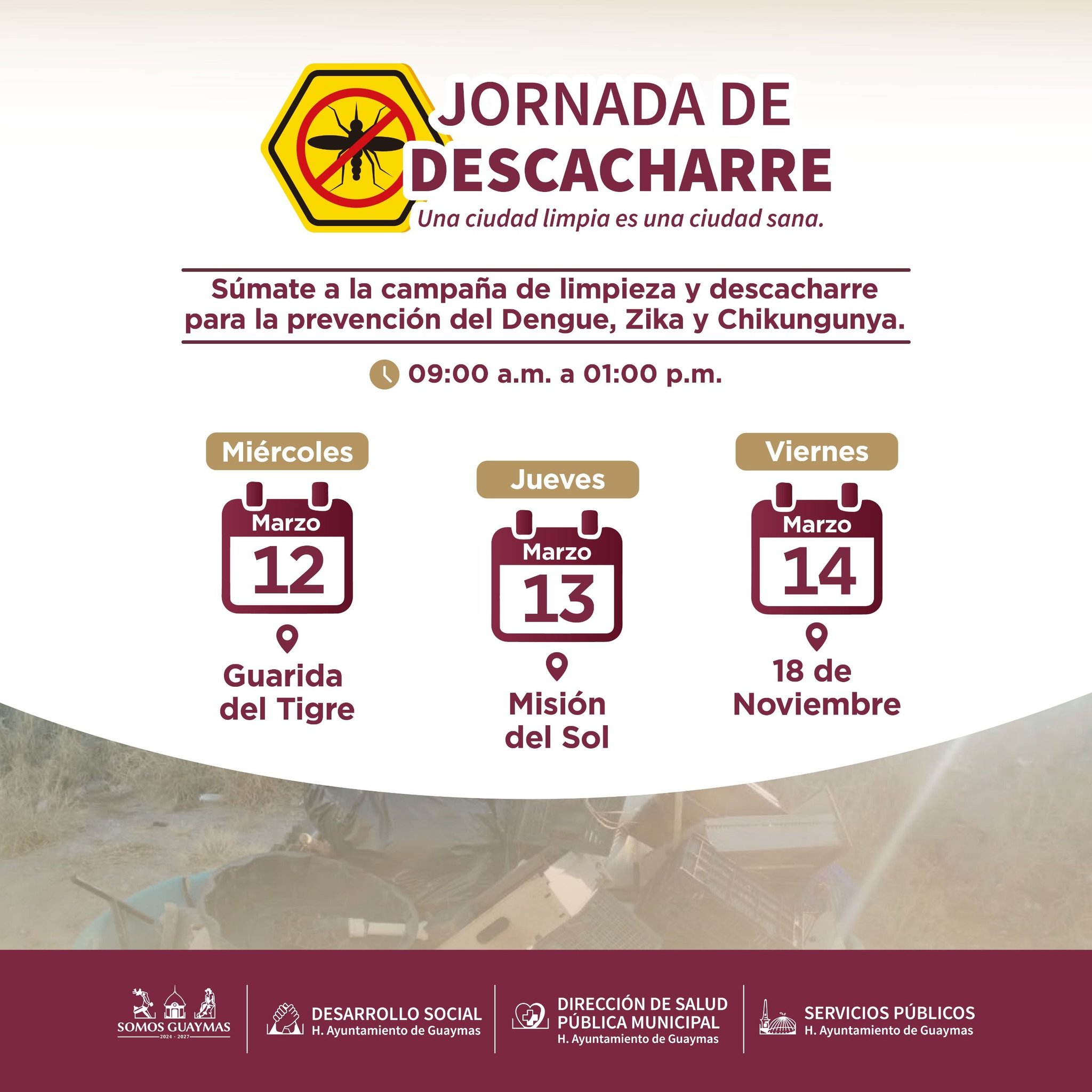 Guaymas, Sonora â La ciudad de Guaymas llevarà a cabo una Jornada de Descacharre del 12 al 14 de marzo, en la que se retirarÃn colchones viejos, llantas, basura y otros objetos que puedan convertirse en criaderos de mosquitos. Esta iniciativa, liderada por la doctora Karla CÃrdova GonzÃlez, busca prevenir enfermedades como el dengue, zika y chikungunya.